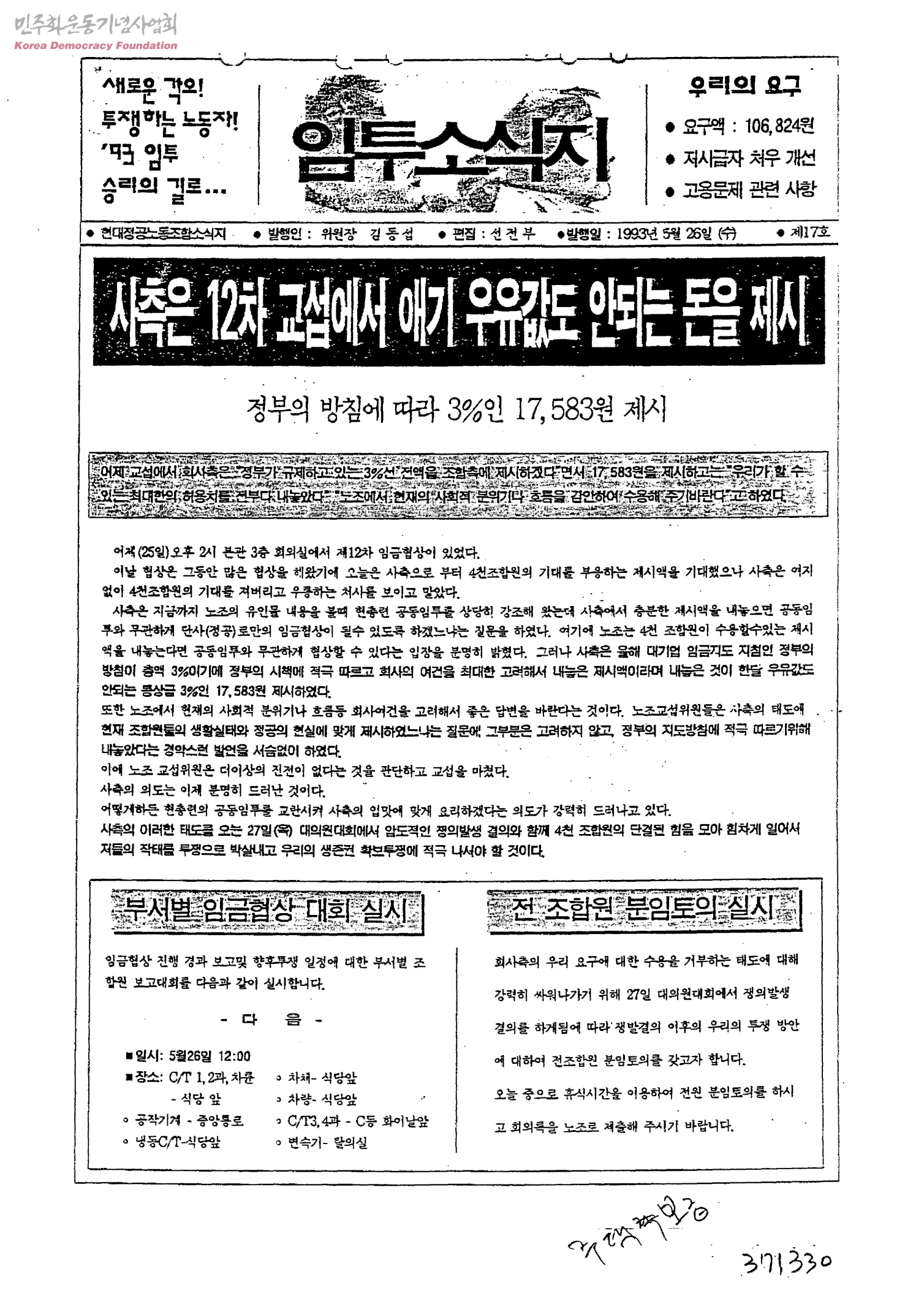 - 사측은 12차 교섭에서 애기 우유값도 안되는 돈을 제시 - 정부의 방침에 따라 3%인 17,583원 제시 27일 대의원대회에 전원 참석, 전원 찬성으로 쟁발결의를!!