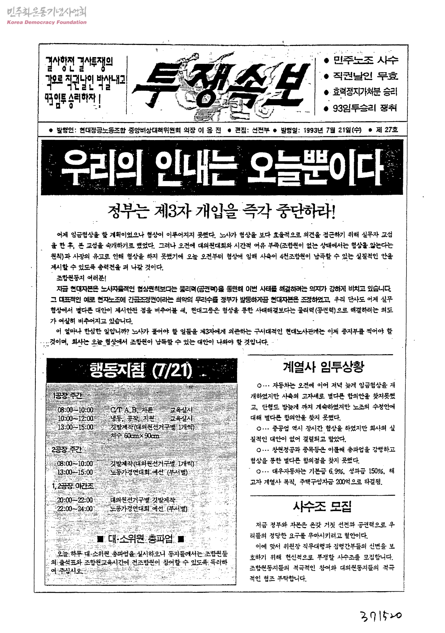 - 우리의 인내는 오늘뿐이다 - 정부는 제3자 개입을 즉각 중단하라! 정부는 노사자율협상을 침해말라! - 정부의 긴급조정권 발동은 헌정사에 크나큰 오점을 남기는 것!