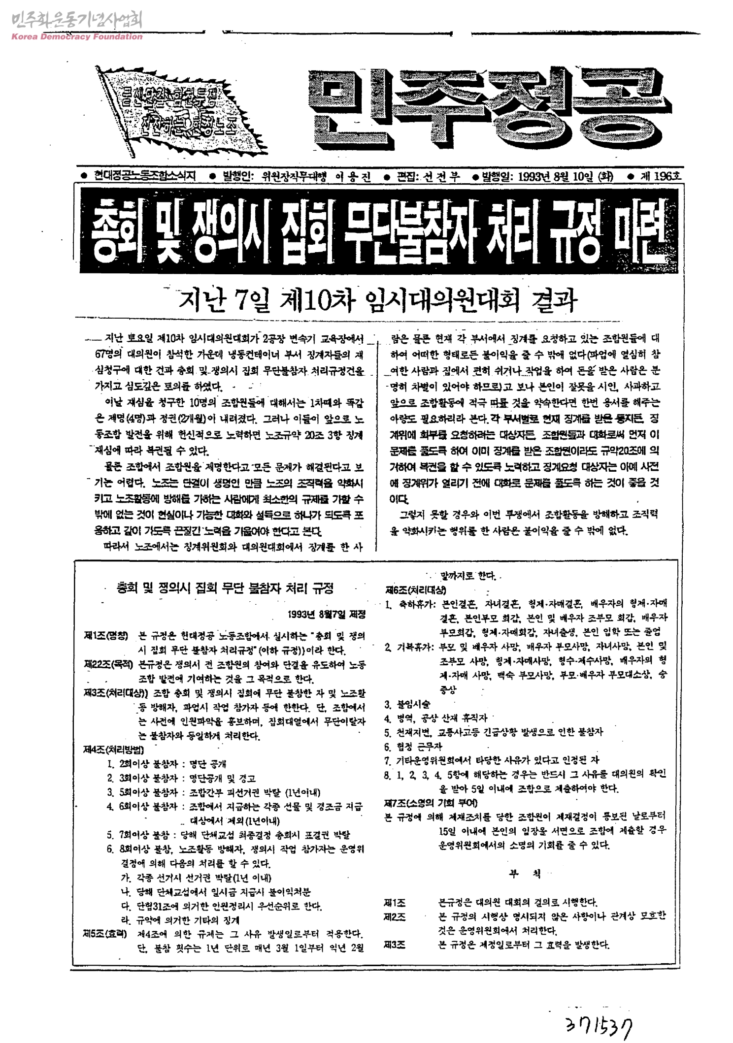 - 총회 및 쟁의시 집회 무단불참자 처리 규정 마련 - 지난 7일 제10차 임시대의원대회 결과 계열사 임금교섭 진행 내용