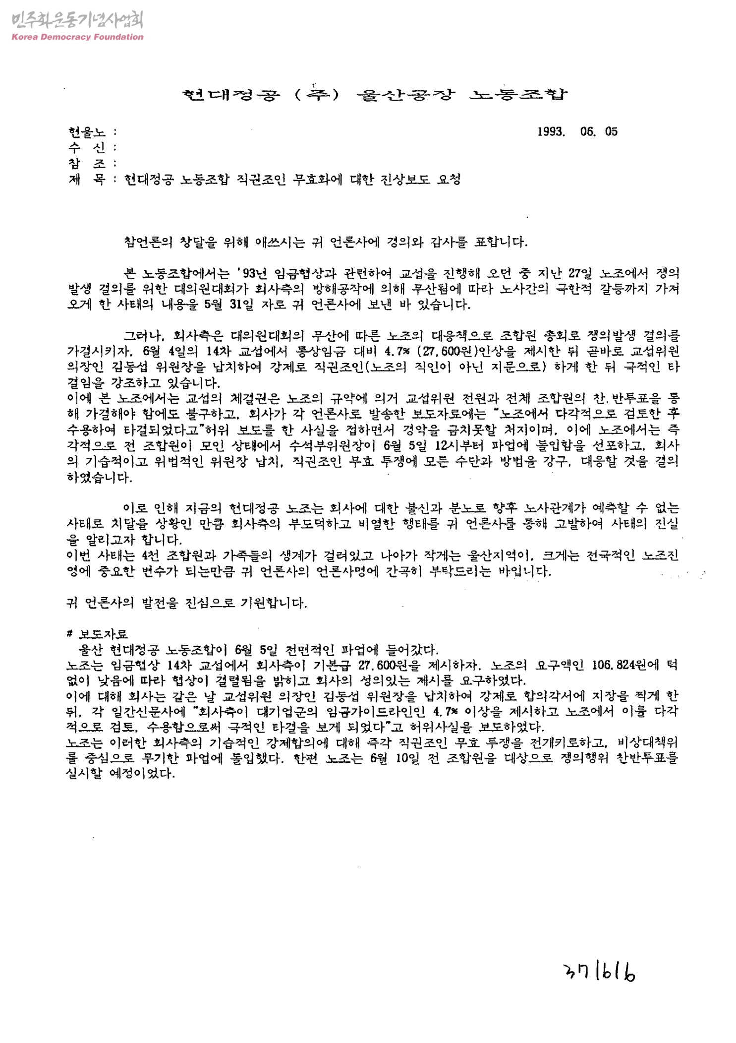 현대정공 노동조합 직권조인 무효화에 대한 진상보도 요청