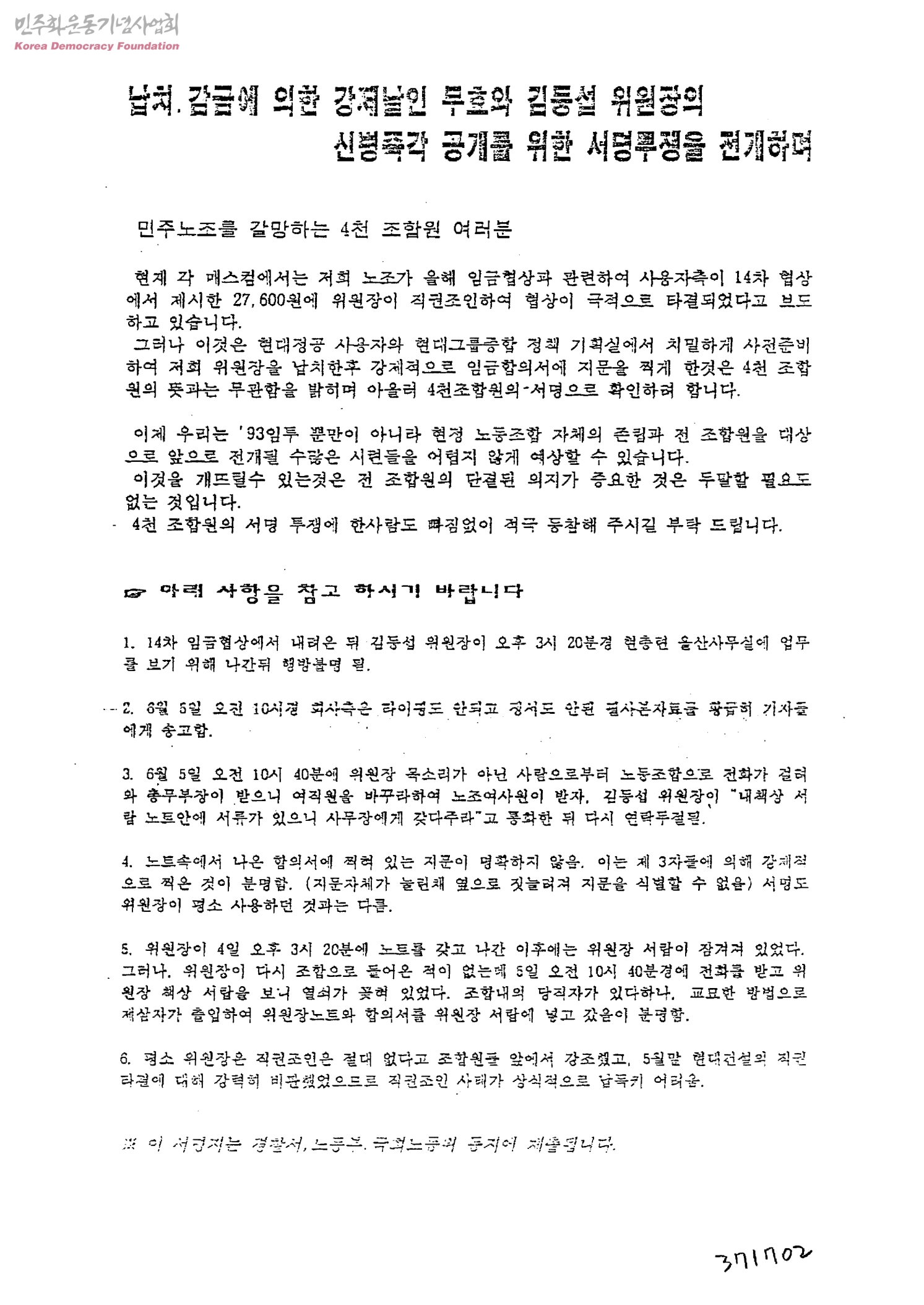 납치. 감금에 의한 강제날인 무효와 김동섭 위원장의 신병즉각 공개를 위한 서명투쟁을 전개하며
