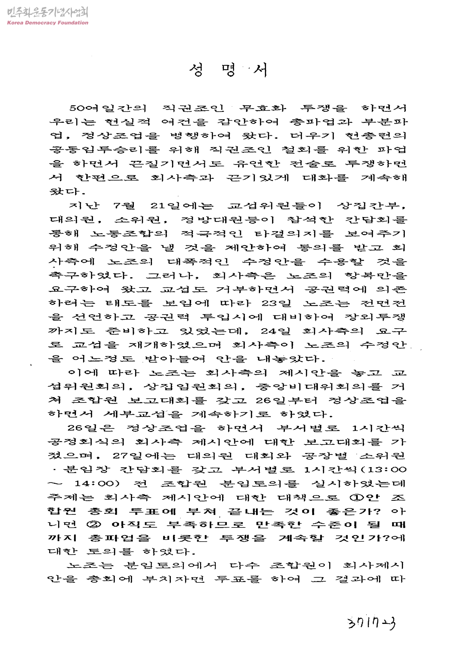 성명서[50여일간의 직권조인 무효화 투쟁을 하면서...]