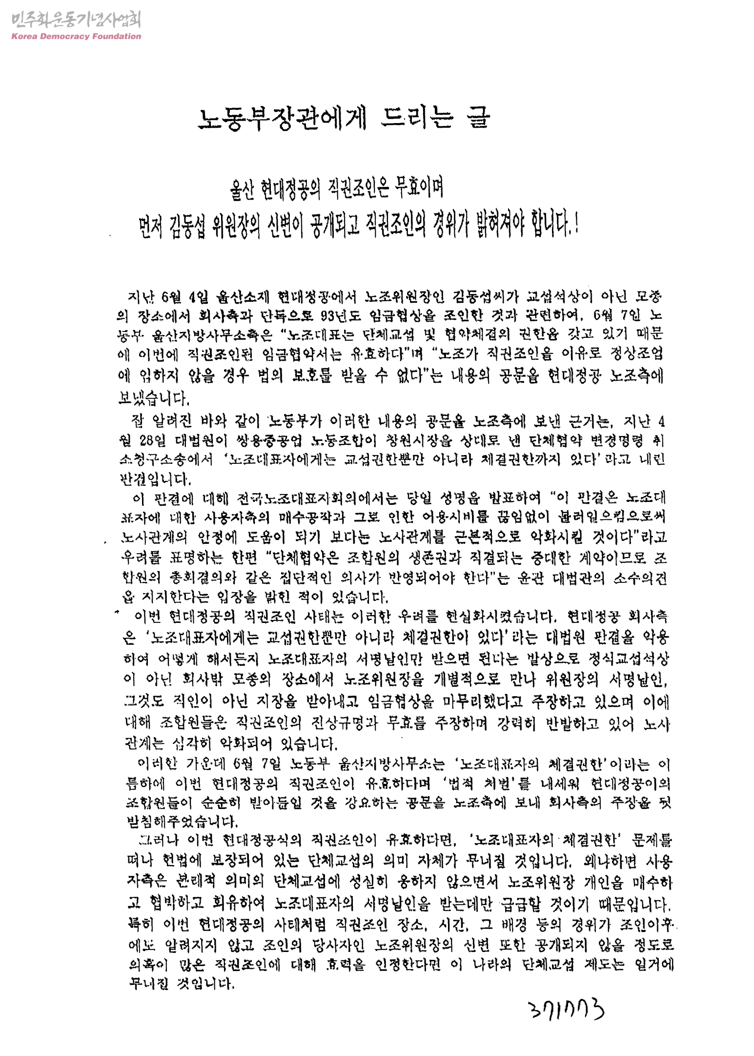 노동부장관에게 드리는 글 - 울산 현대정공의 직권조인은 무효이며 먼저 김동섭 위원장의 신변이 공개되고 직권조인의 경위가 밝혀져야 합니다.!