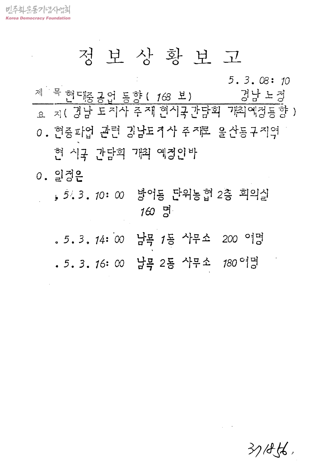 - 골리앗 크레인 농성자 입원, 민주광장에 대한 경력선점 및 수색결과, 현자 노조 유인물 제작 배부동향, 경남도지사 주재 현시국간담회 개최예정동향 등.