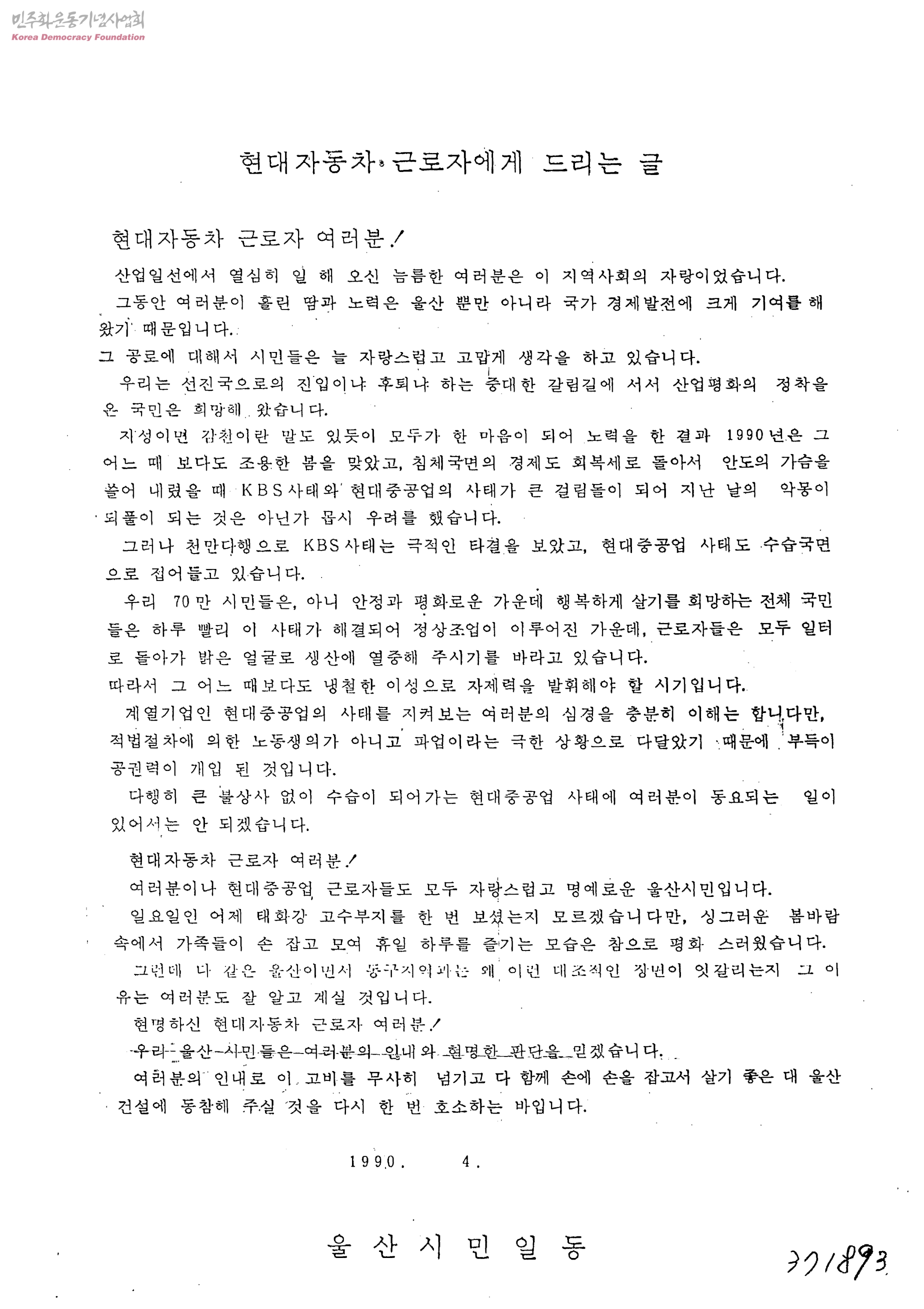 - 현대자동차 근로자들의 인내로 고비를 넘기고 다함께 살기 좋은 울산 건설에 동참해 줄 것을 호소하는 글