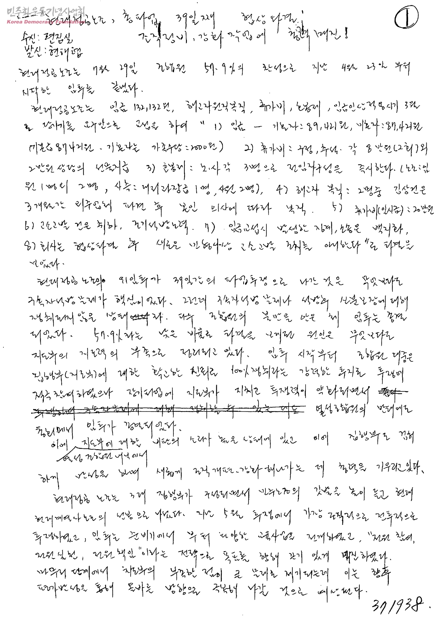 현대정공노조, 총파업 39일째 협상타결: 조직정비,강화 작업에 총력매진![수신:편집실,발신:현해협]