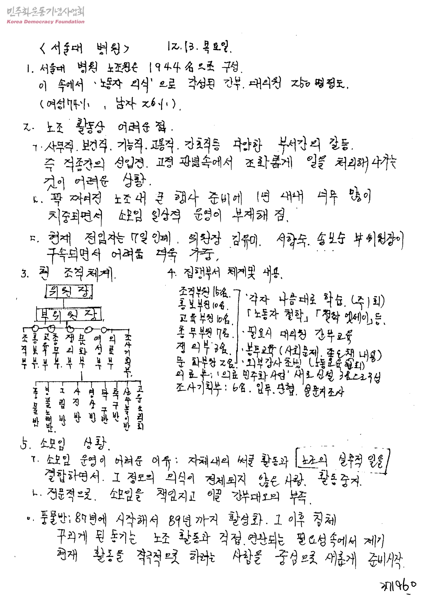 - 1.노조원 2.노조 활동상 어려운 점 3.현 조직체계 4.소모임 상황(풍물반, 노래반, 그림반, 영상반, 탁구반, 축구반, 신수놀이반, 고운소리회)