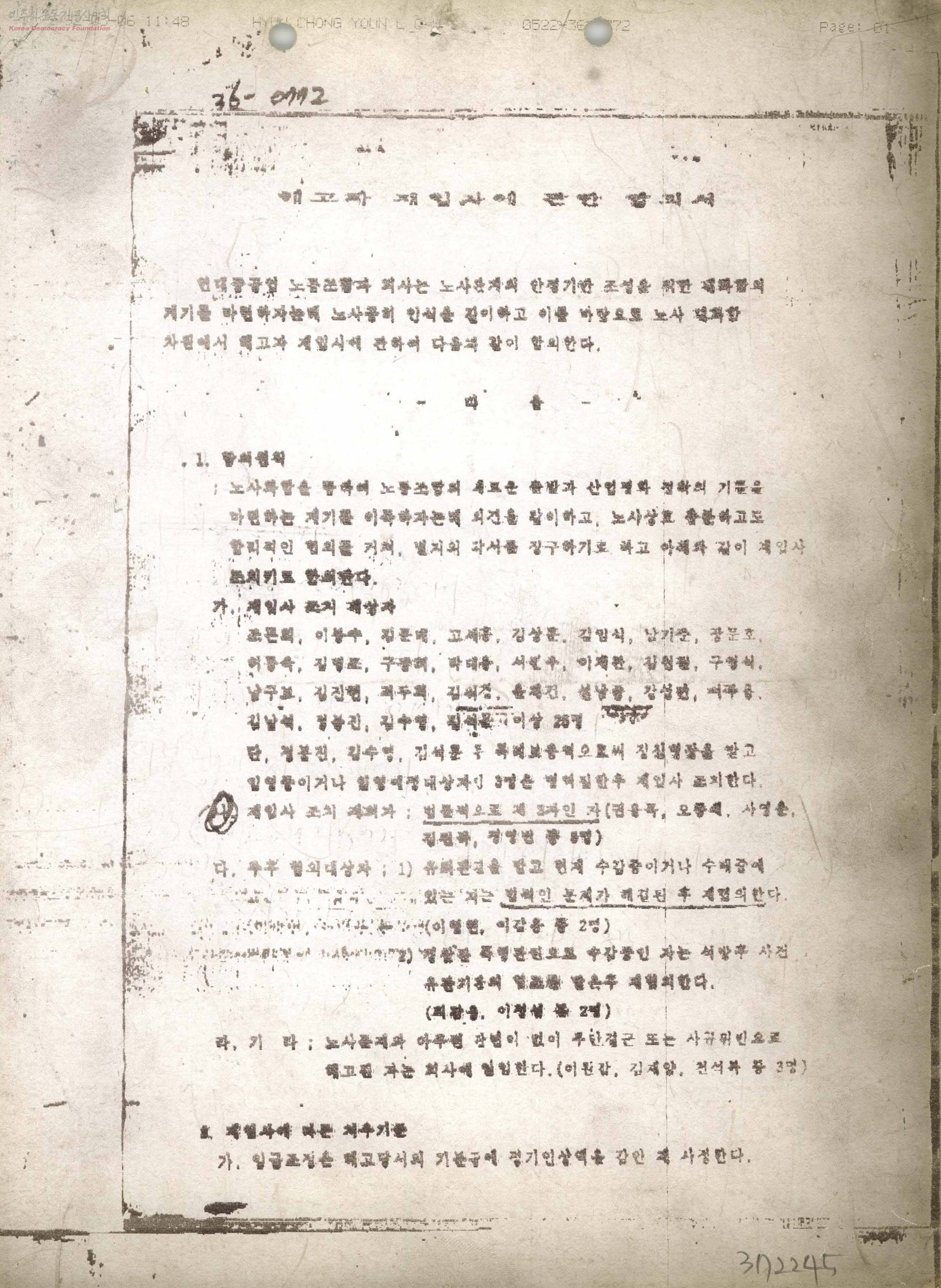- 현대중공업 노동조합과 회사는 노사관계의 안정기반 조성을 위해 노사 화합의 차원에서 해고자 재입사에 관해 합의한다. 1. 합의원칙 2. 재입사에 따른 처우기준 3. 재입사 조치 일자 등의 내용