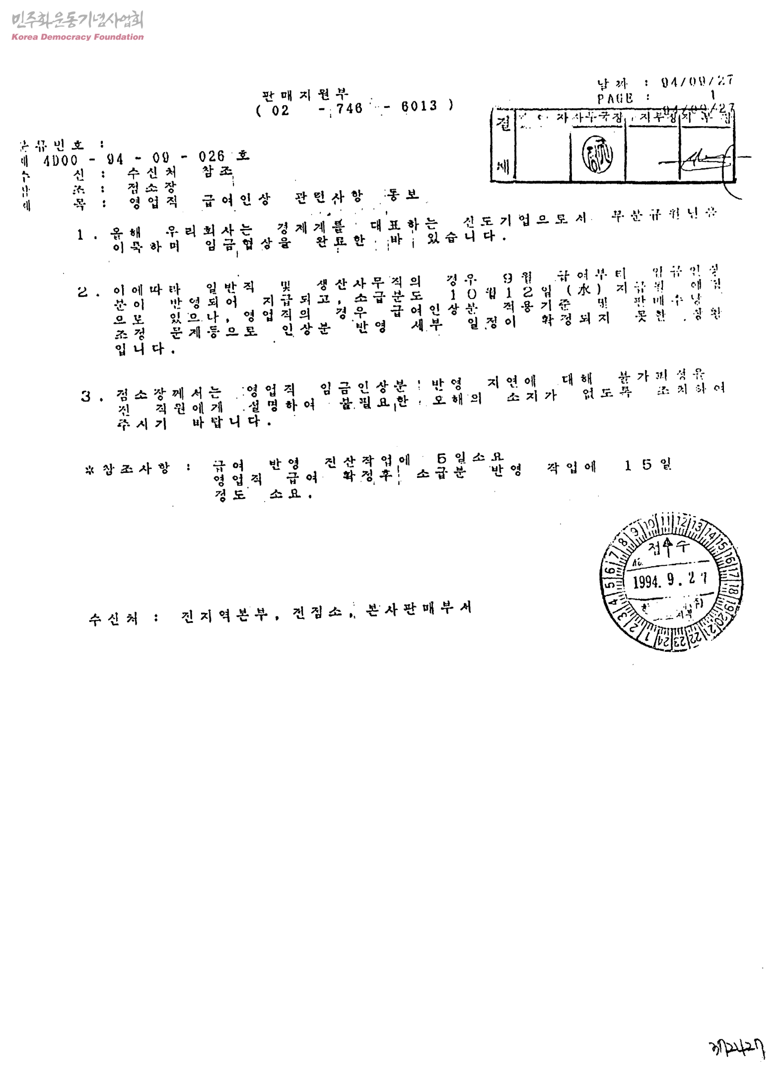 [현총련 고소고발 관련문서]영업직 급여인상 관련사항 통보[발신:현대자동차판매지원부,수신:전지역본부,전점소,본사판매부서]