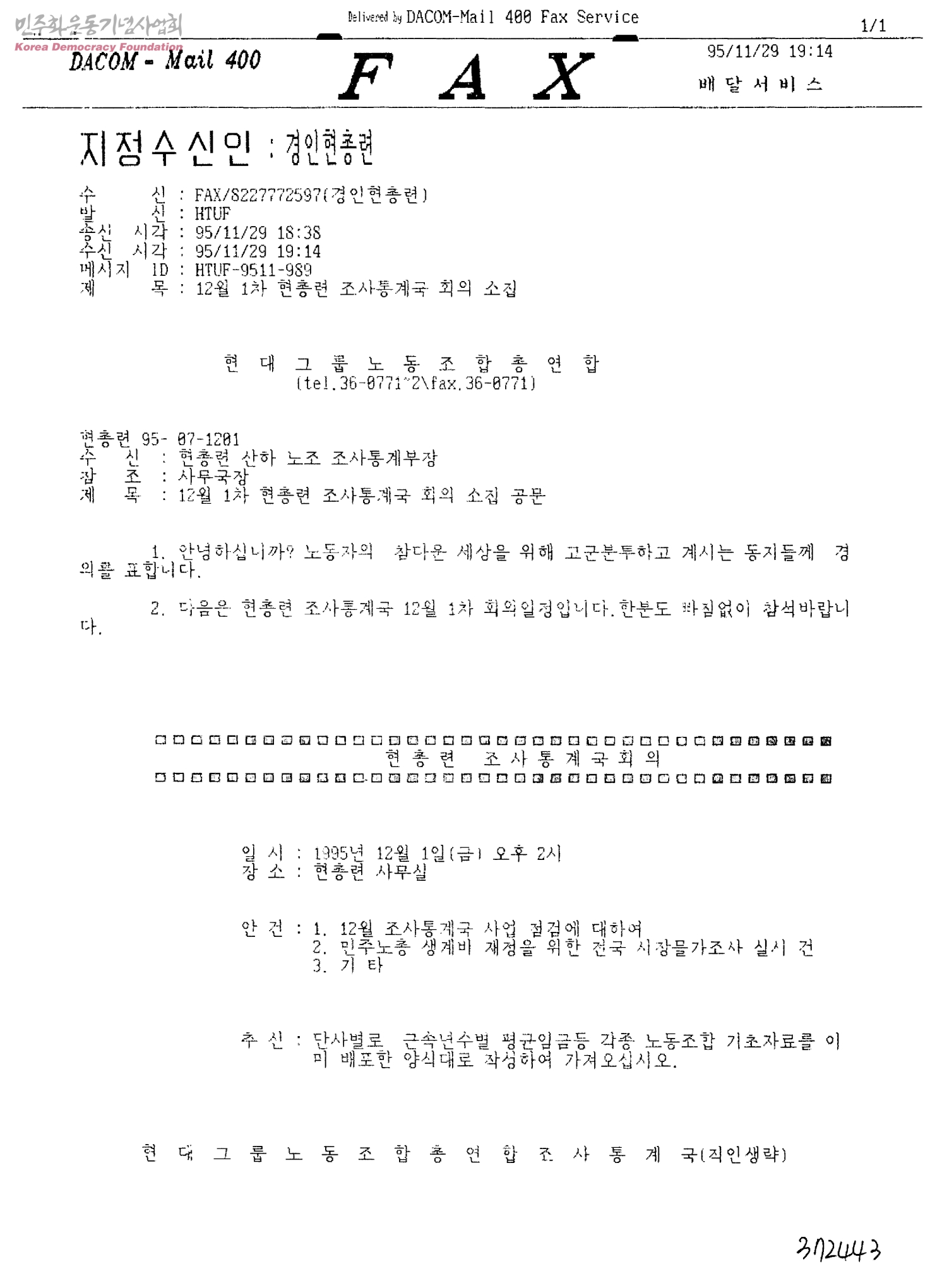 12월 1차 현총련 조사통계국 회의 소집 공문[수신:현총련산하노조 조사통계부장,발신:현대그룹노동조합총연합]