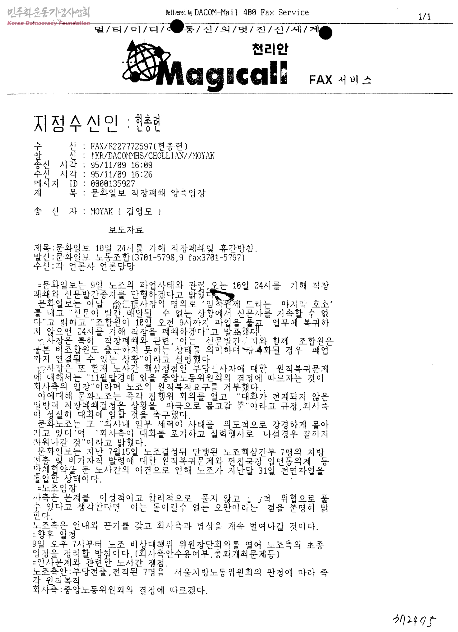 보도자료-문화일보 10일 24시를 기해 직장폐쇄및 휴간방침[수신:각 언론사 언론담당,발신:문화일보노동조합]