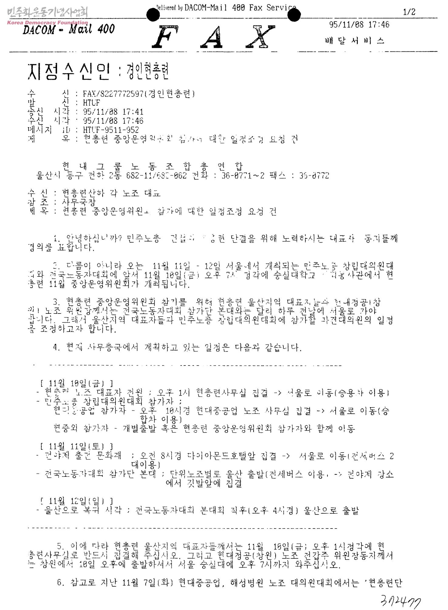 현총련 중앙운영위원회 참가에 대한 일정조정 요청 건[수신:현총련산하 각노조대표,발신:현대그룹노동조합총연합]