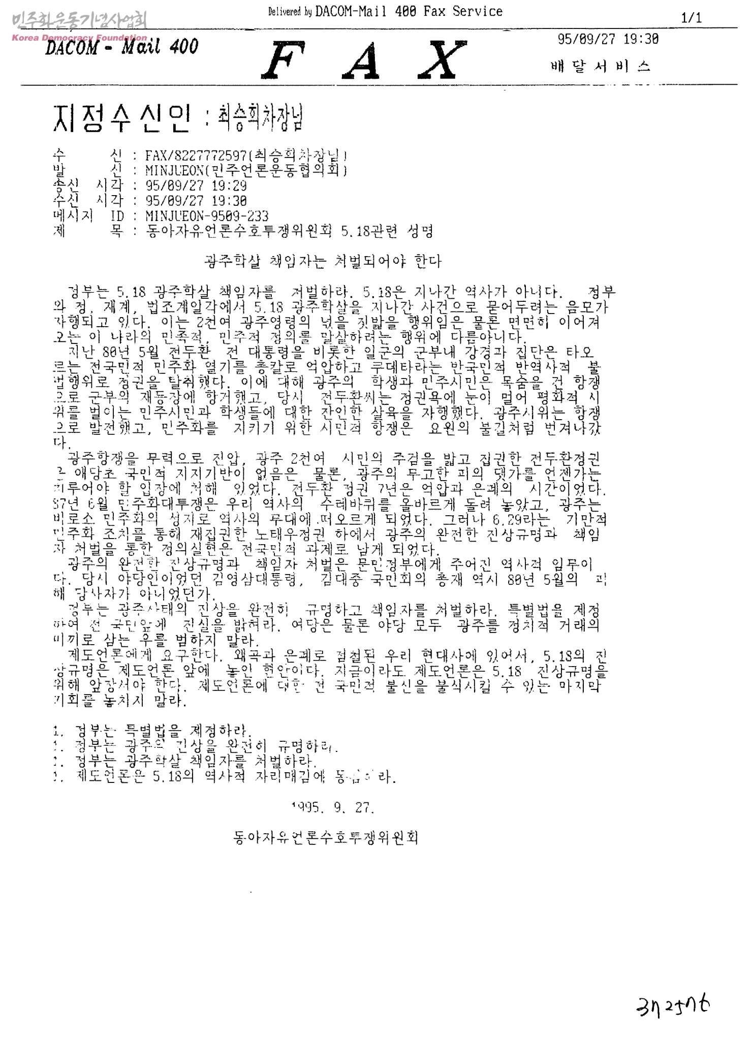 동아자유언론수호투쟁위원회 5.18관련 성명[수신:최승희차장,발신:민주언론운동협의회]