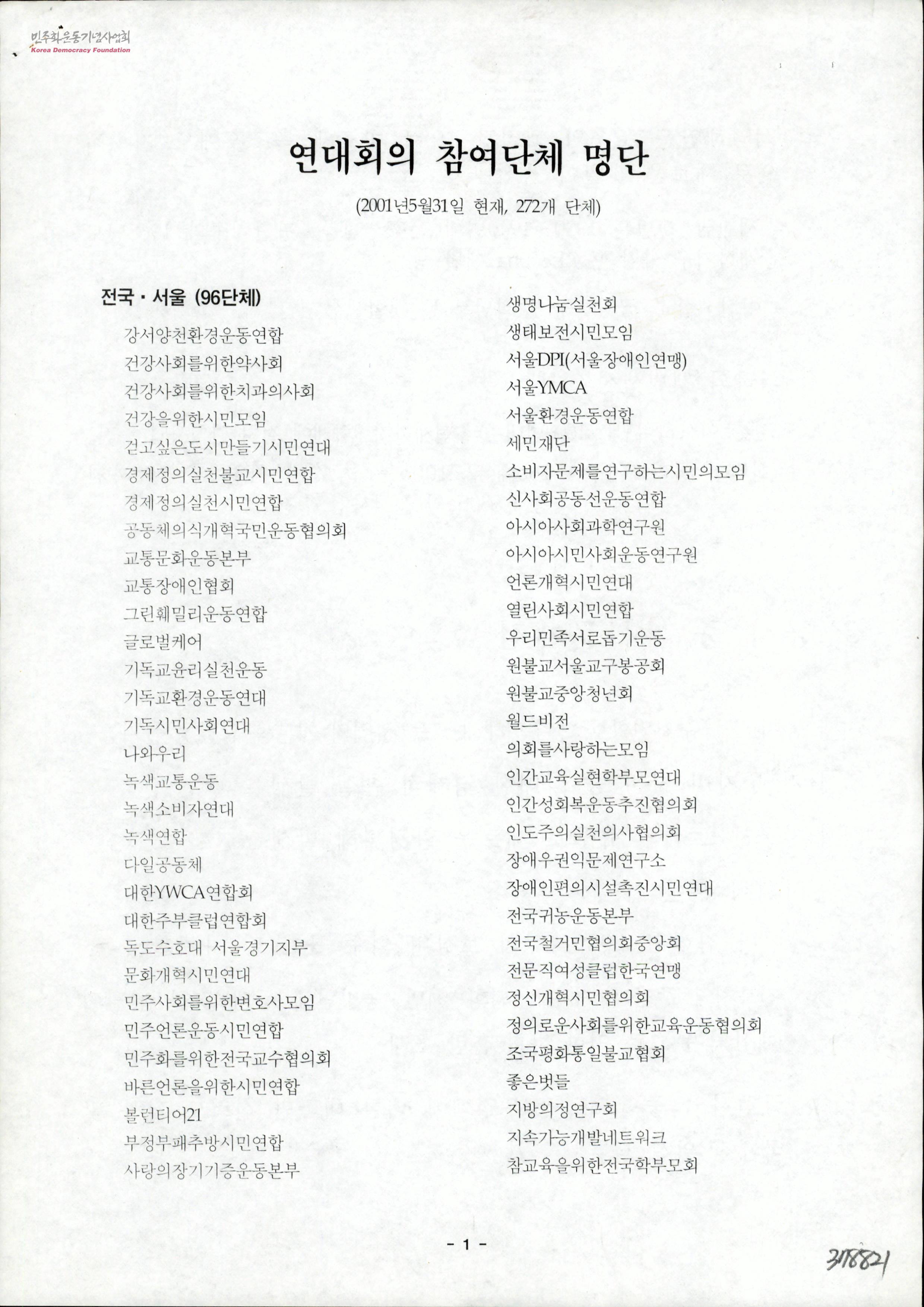 연대회의 참여단체 명단(2001년5월31일 현재, 272개 단체)