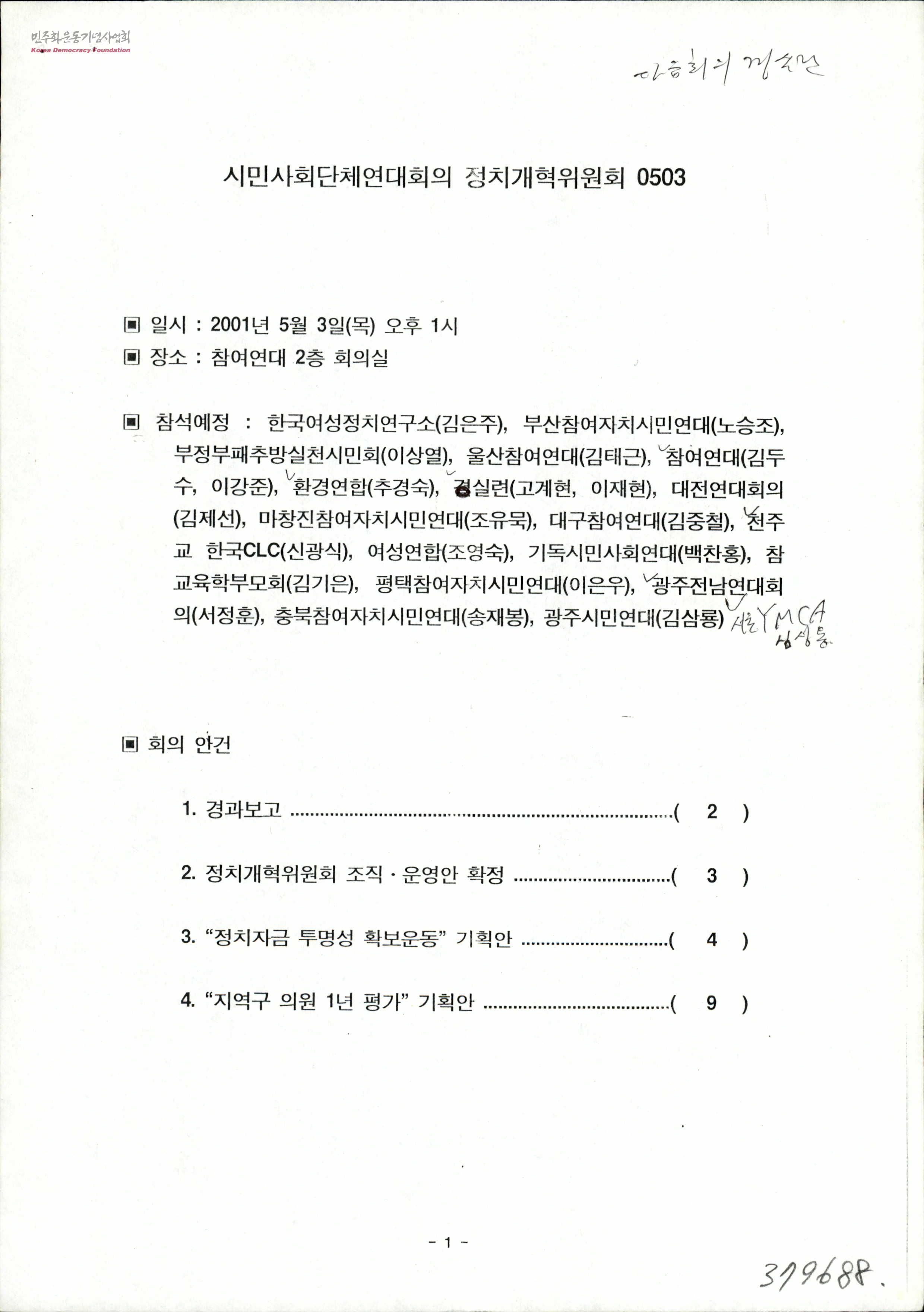 - 회의안건 1)경과보고 2)정치개혁위원회 조직.운영안 확정 3)정치자금 투명성 확보운동 기획안 4)지역구 의원 1년 평가 기획안