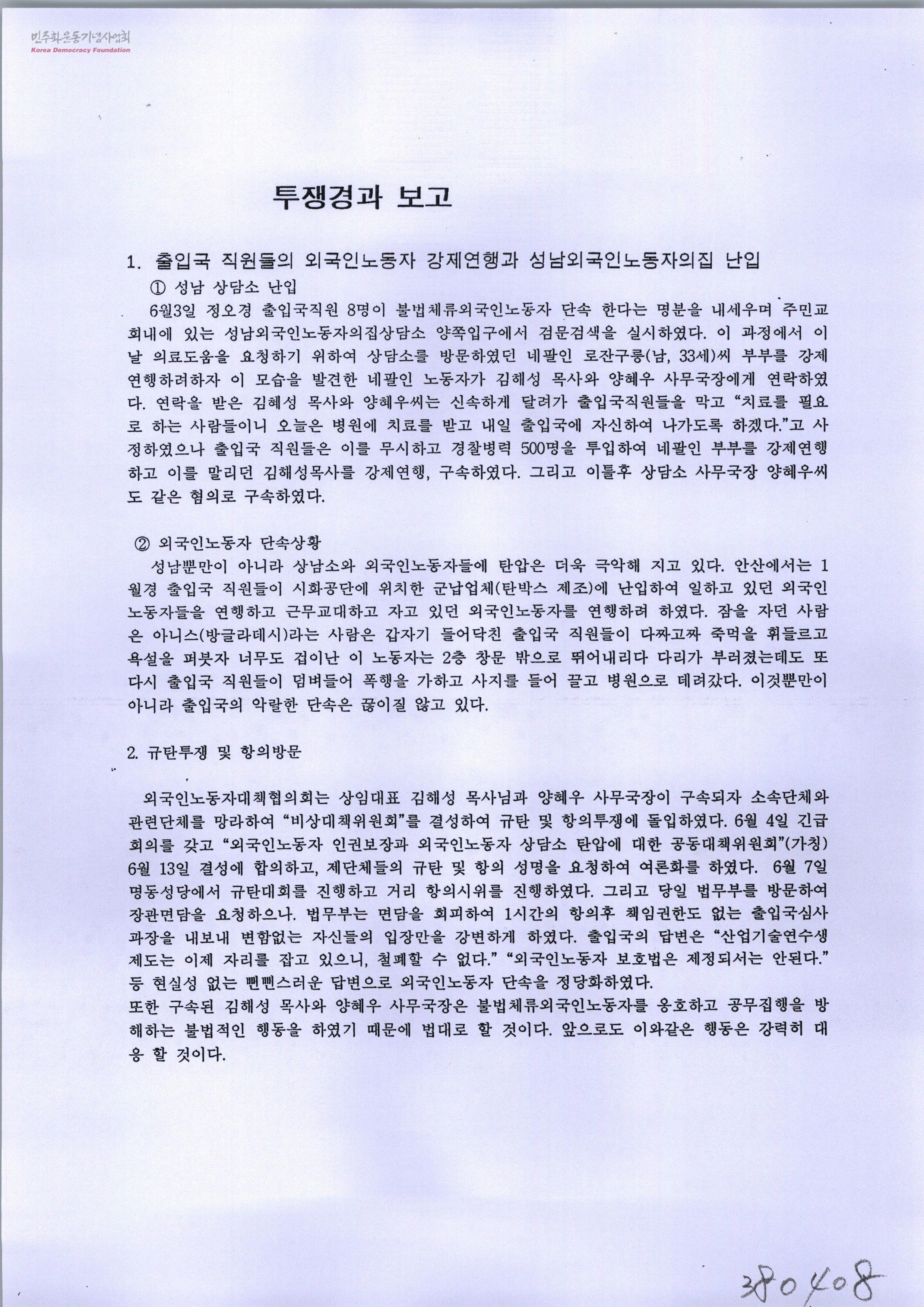 투쟁경과 보고-출입국 직원들의 외국인노동자 강제연행과 성남외국인노동자의집 난입