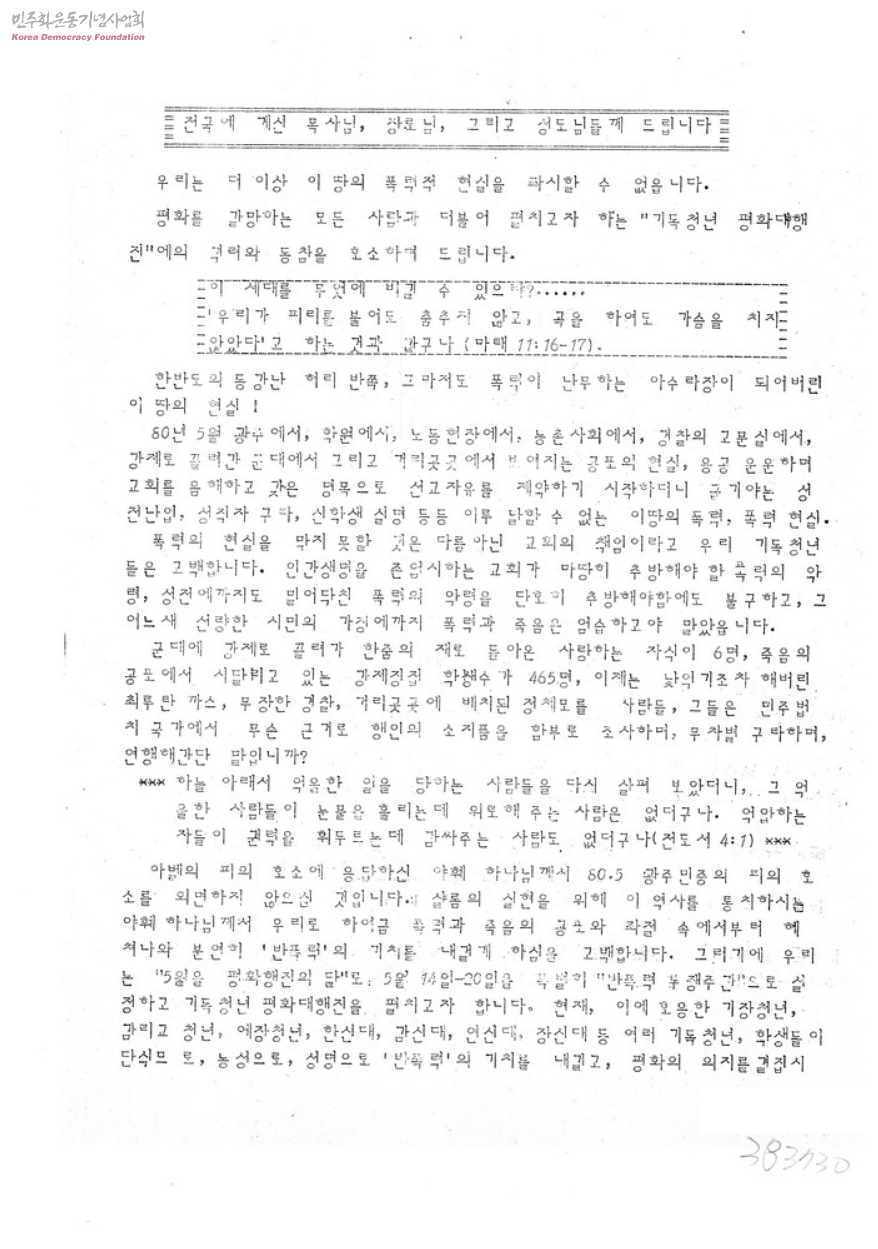 - "기독청년 평화 대행진" 격려와 동참을 호소