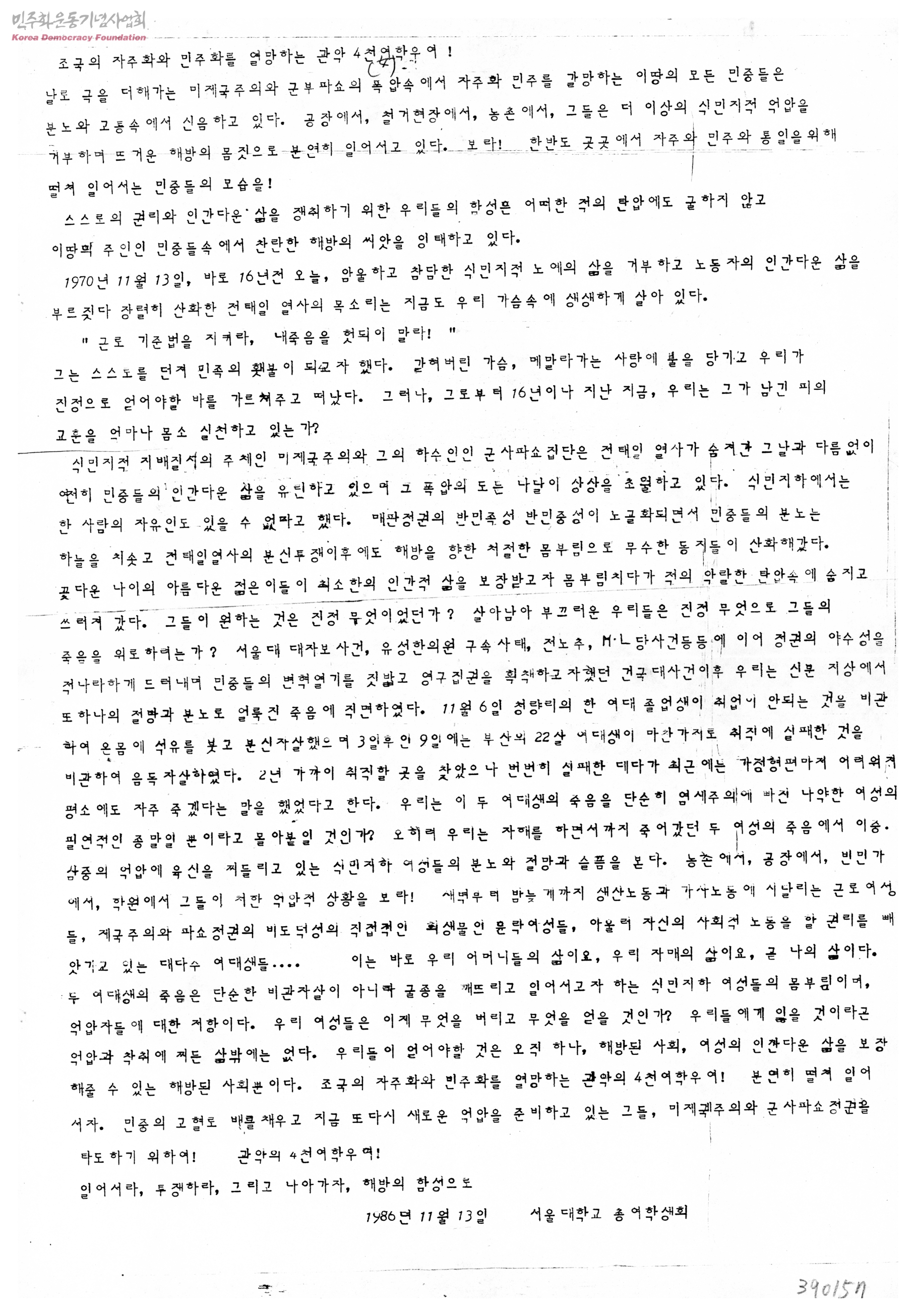 조국의 자주화와 민주화를 열망하는 관악 4천여학우여!