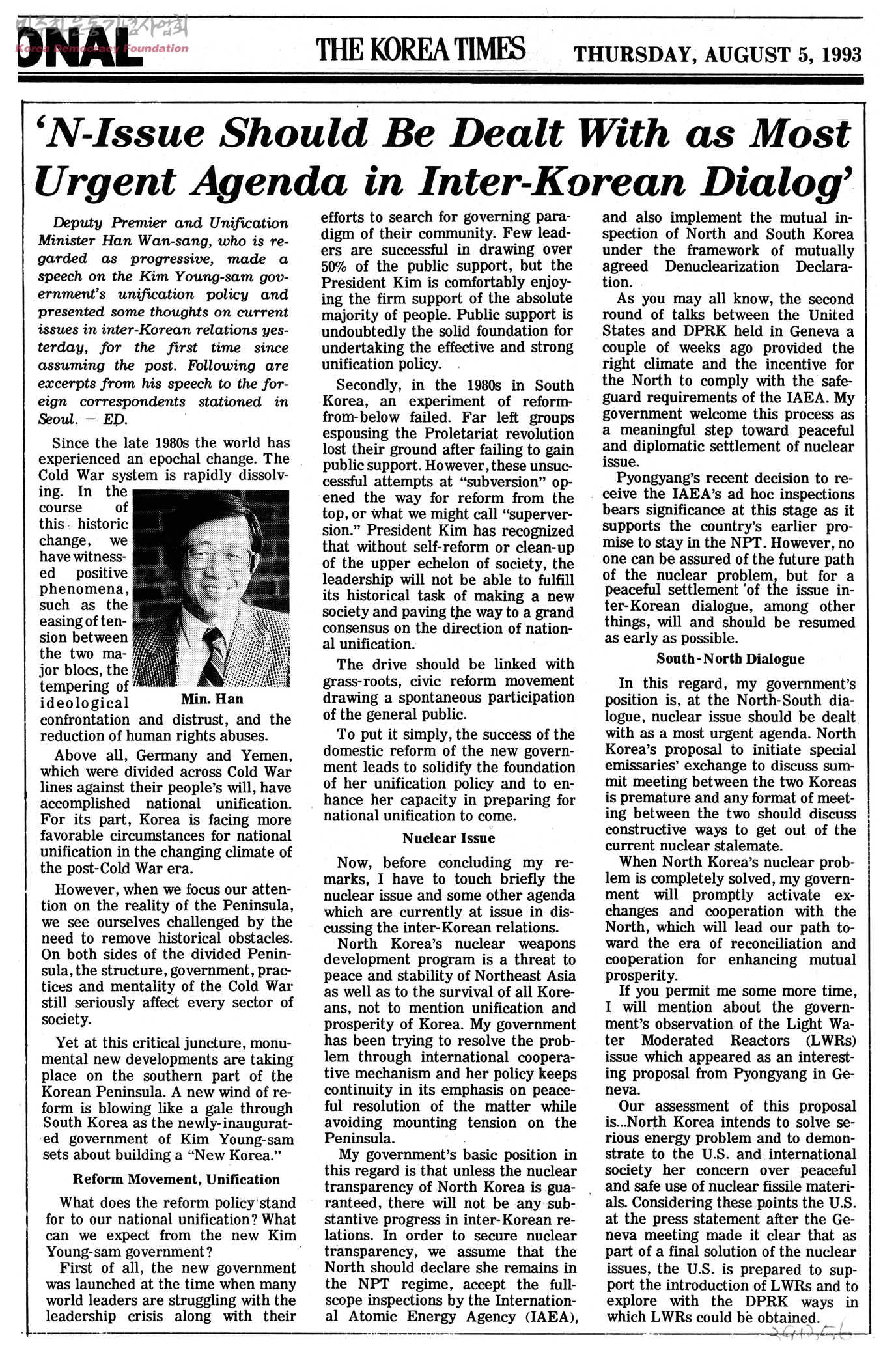 [신문스크랩]'N-Issue Should Be Dealt With as Most Urgent Agenda in Inter-Korean Dialog'