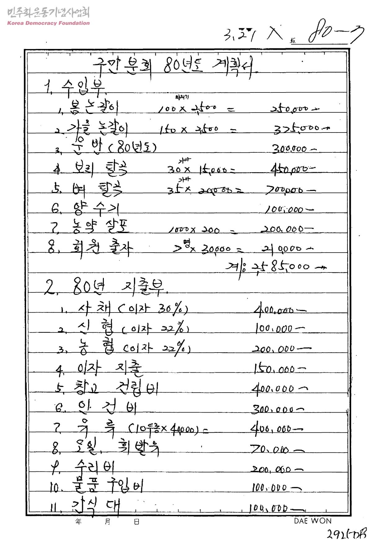 - -농기계구입 사채상환과 창고건축비 지원요청 사업 -협동자금 신청건 첨부: 구만분회의 운영 사업보고와 계획서