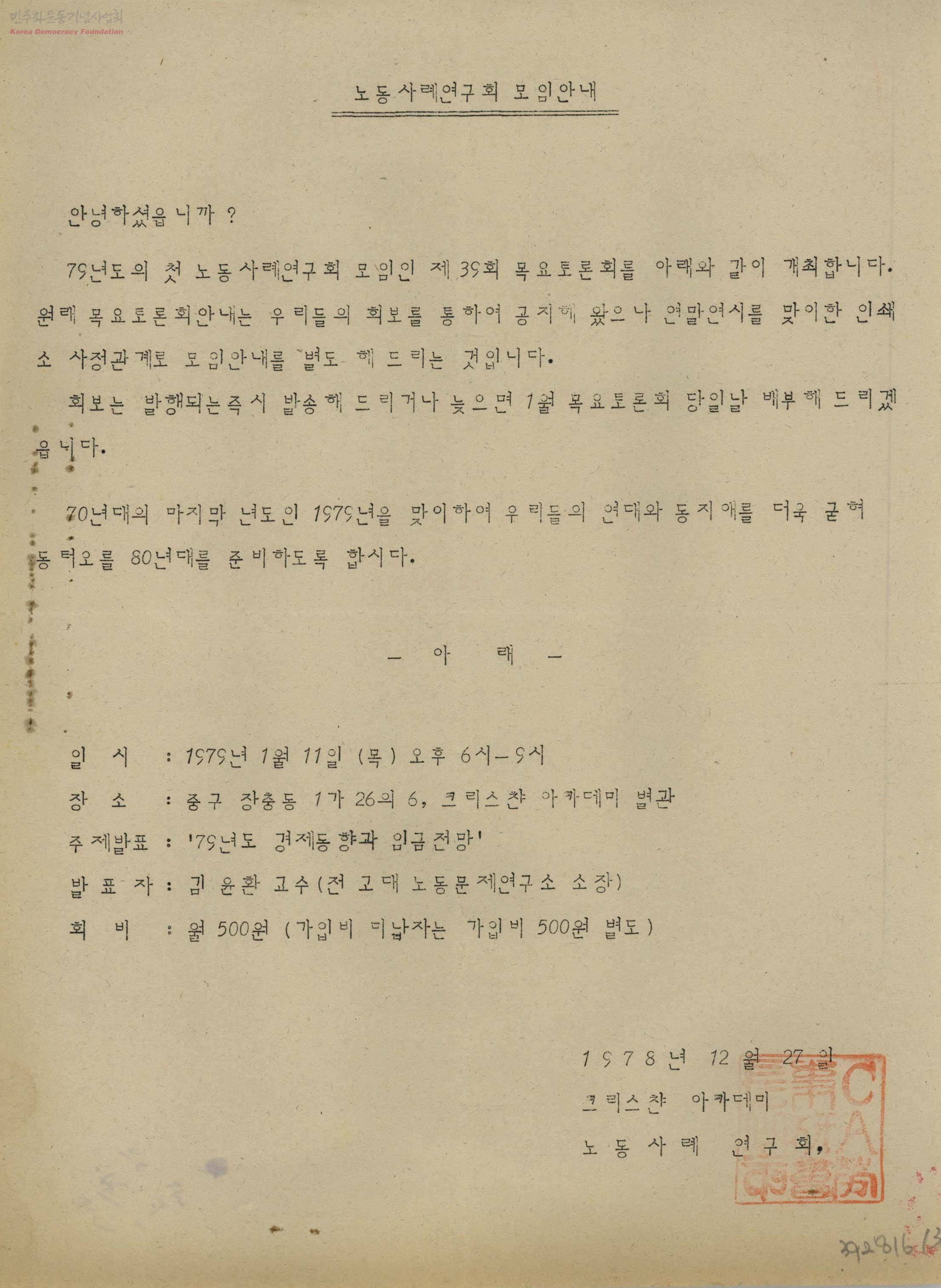 - 79년도 경제동향과 임금전망에 대한 주제의 발표와 모임의 초청문
