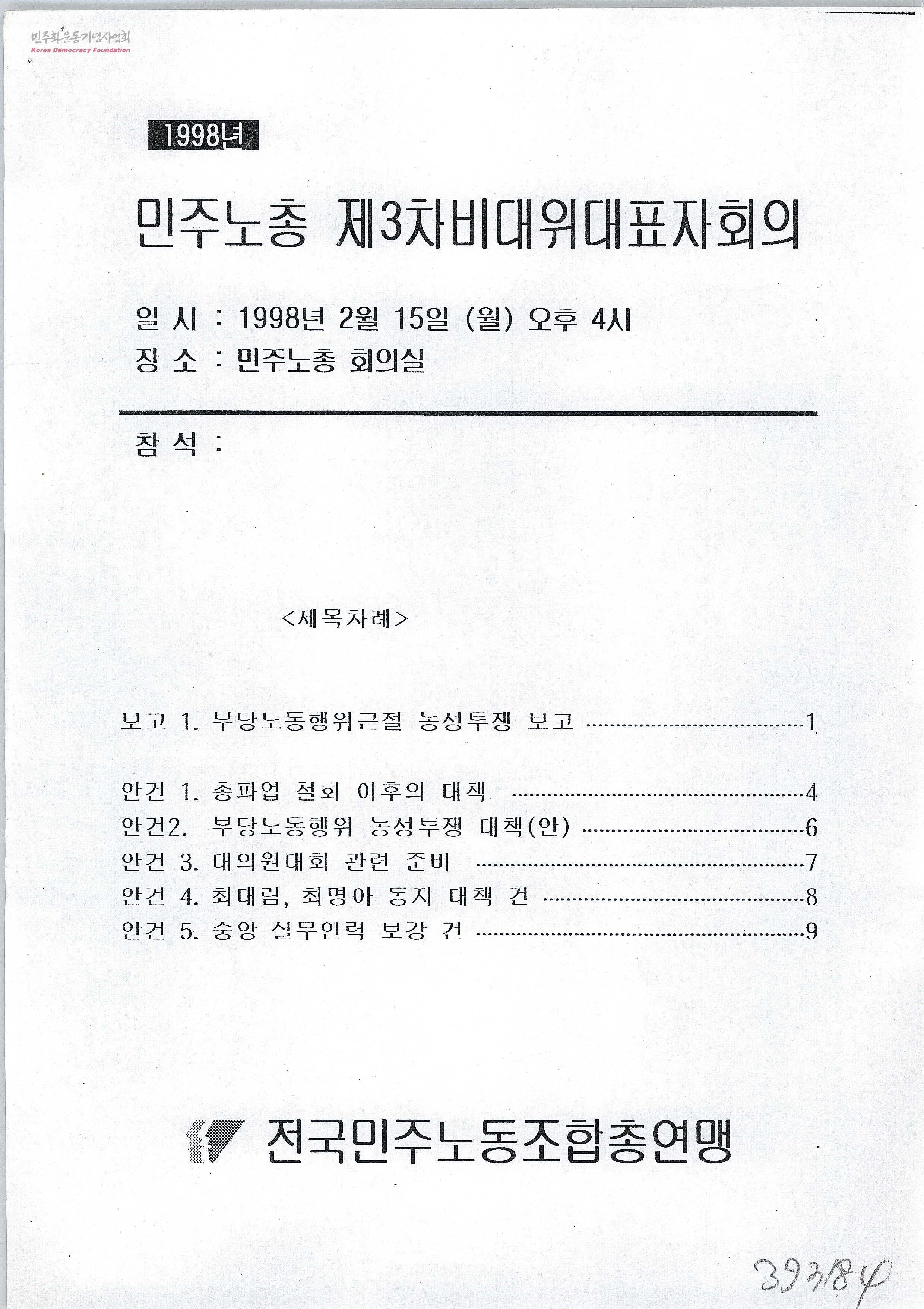 - 1)보고1:부당행위근절 농성투쟁 보고 2)안건1:총파업 철회 이후의 대책 3)안건2:부당노동행위 농성투쟁 대책(안) 4)안건3:최대림,최명아 동지 대책 건 5)안건4:중앙 실무인력 보강 건 6)안건5:대의원대회 관련 준비