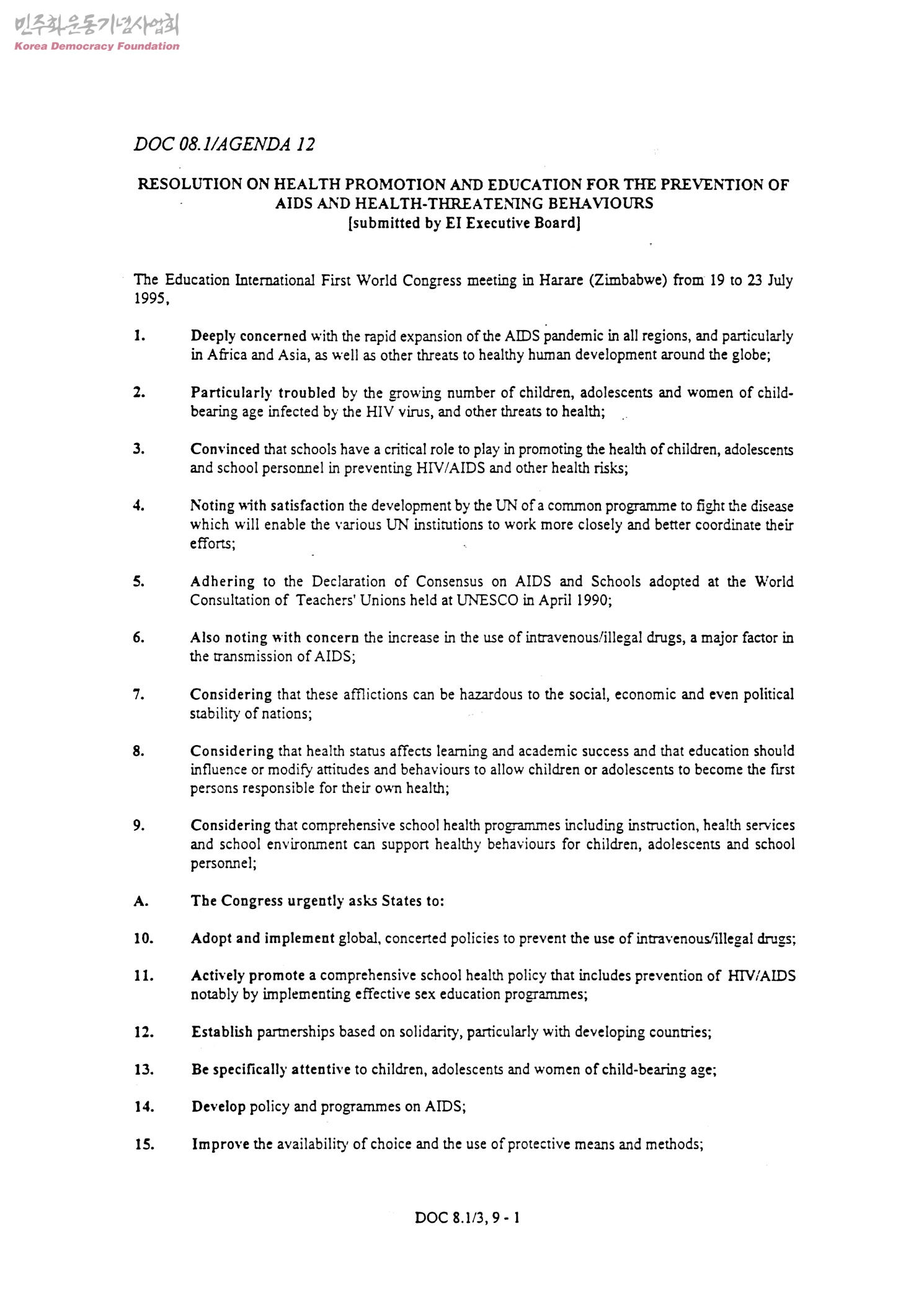 RESOLUTION ON HEALTH PROMOTION AND EDUCATION FOR THE PREVENTION OF AIDS AND HEALTH-THREATENING BEHANIOURS