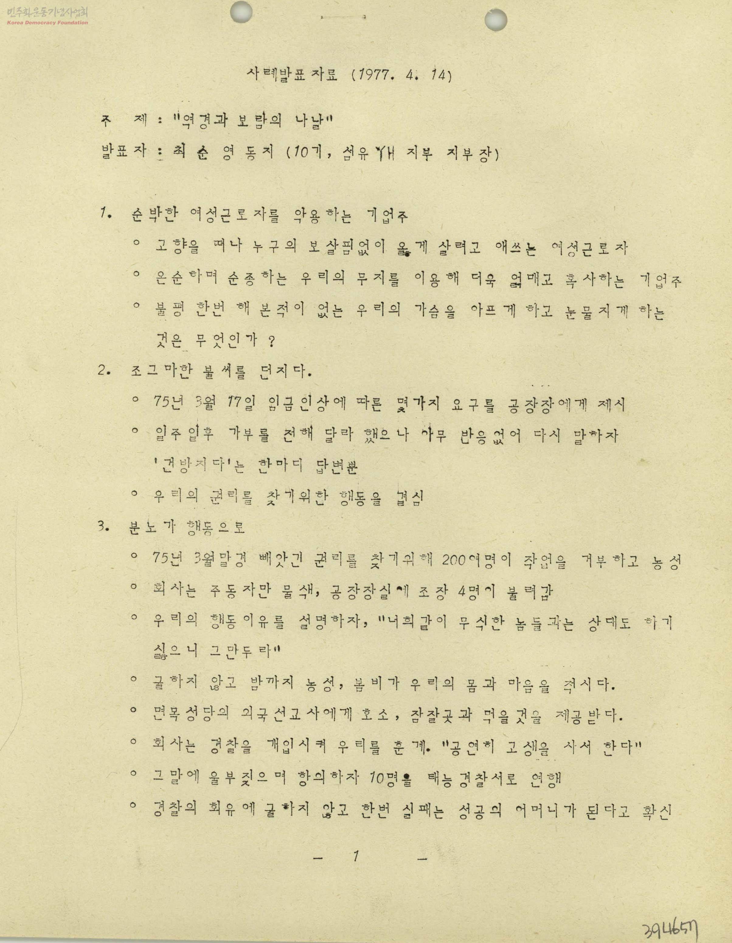 - 여성근로자를 악용하는 기업주에게 임금인상 요구를 하고 권리를 찾기위해 노동조합결성 등의 사례발표