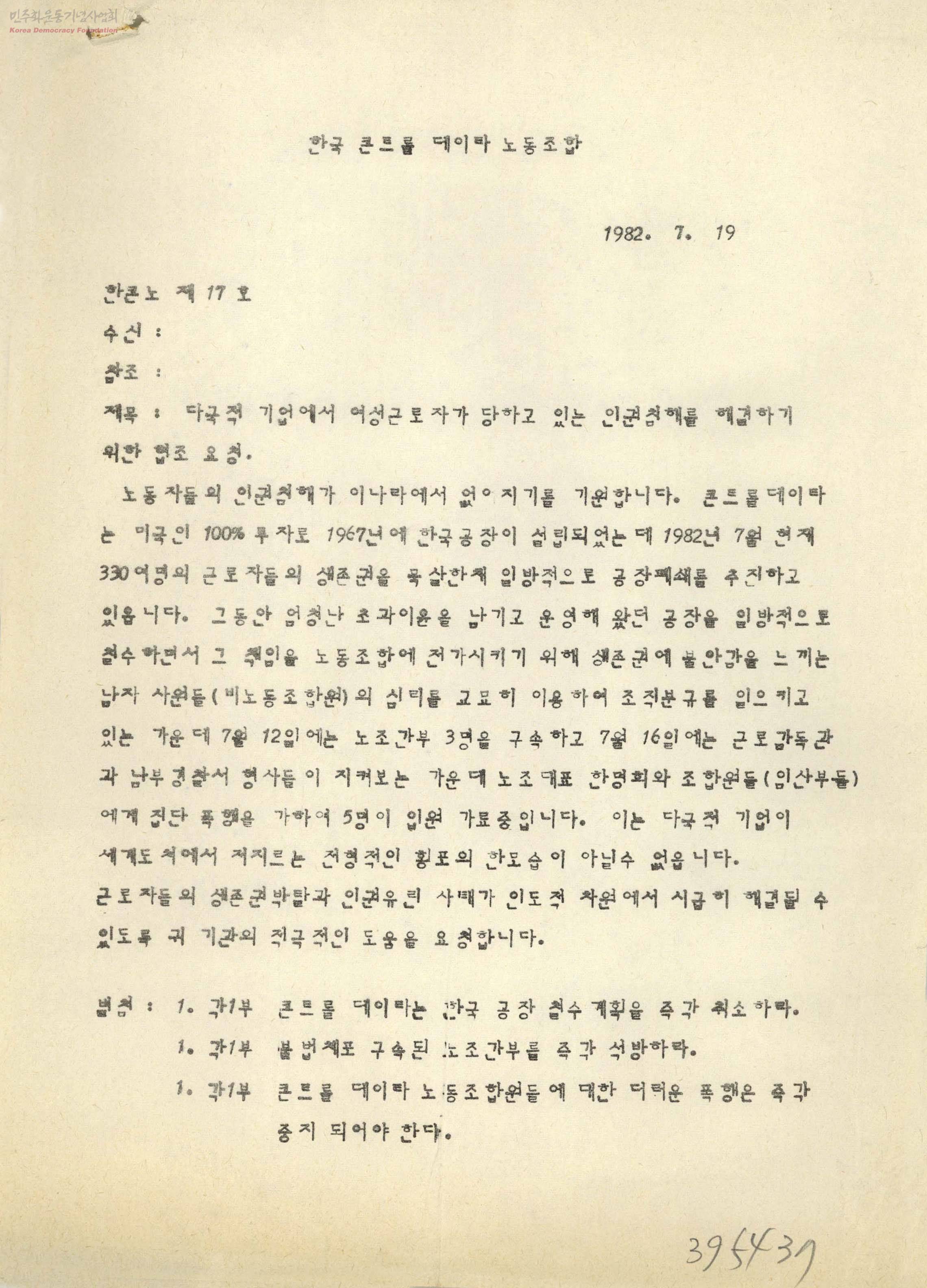 - 다국적 기업에서 여성근로자가 당하고 있는 인권침해를 해결하기 위한 협조 요청 별첨: 1. 각1부 콘트롤 데이타는 한국 공장 철수 계획을 즉각 취소하라. 1. 각1부 불법체포 구속된 노조간부를 즉각 석방하라. 1. 각1부 콘트롤 데이타 노동조합원들에 대한 더러운 폭행은 즉각 중지되어야 한다. 등