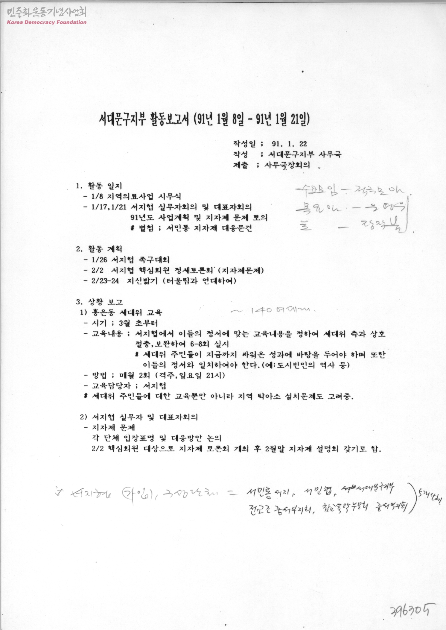 서대문지구 활동보고서(91년 1월 8일-91년 1월 21일)