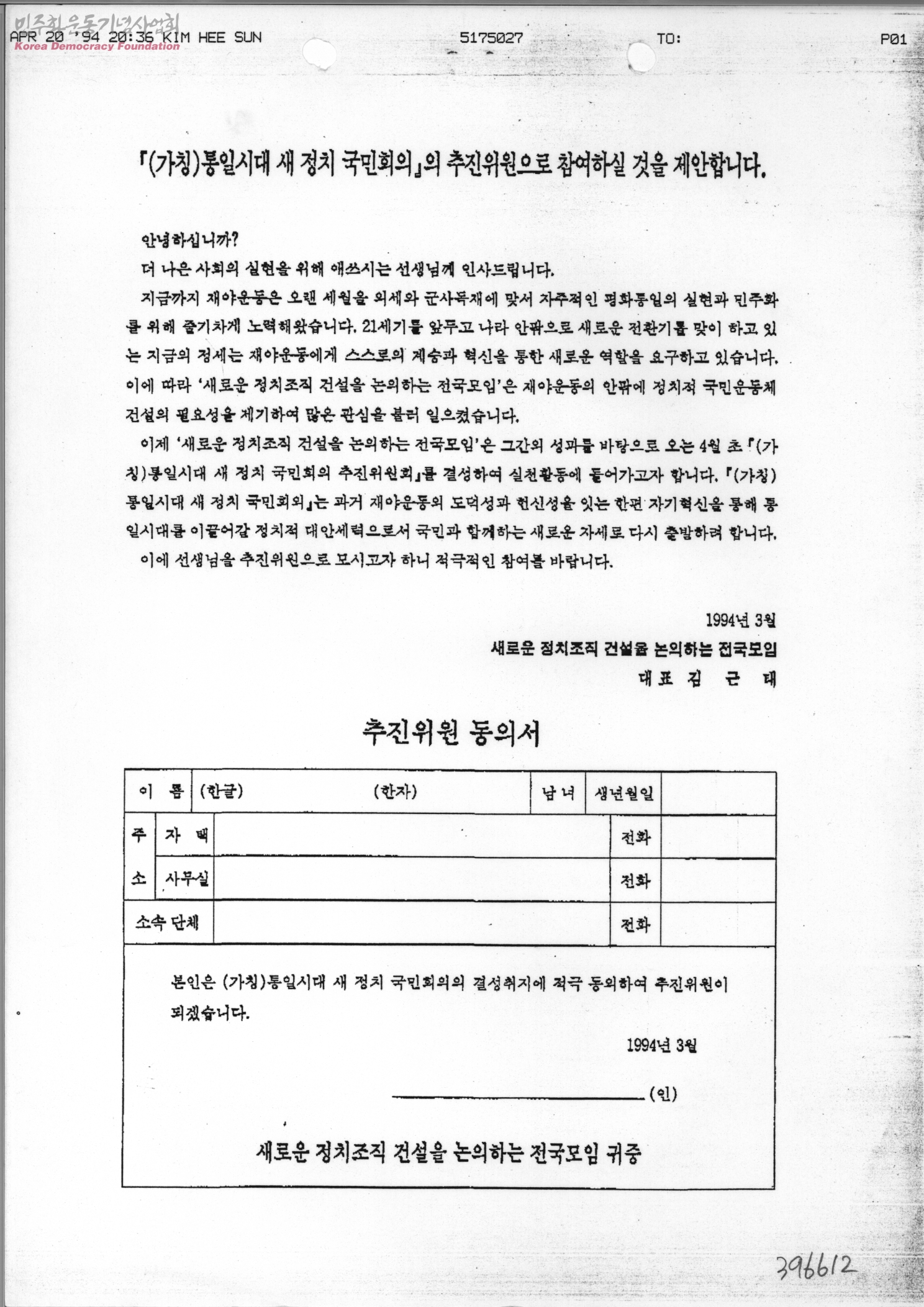 『(가칭)통일시대 새 정치 국민회의』의 추진위원으로 참여하실 것을 제안합니다.