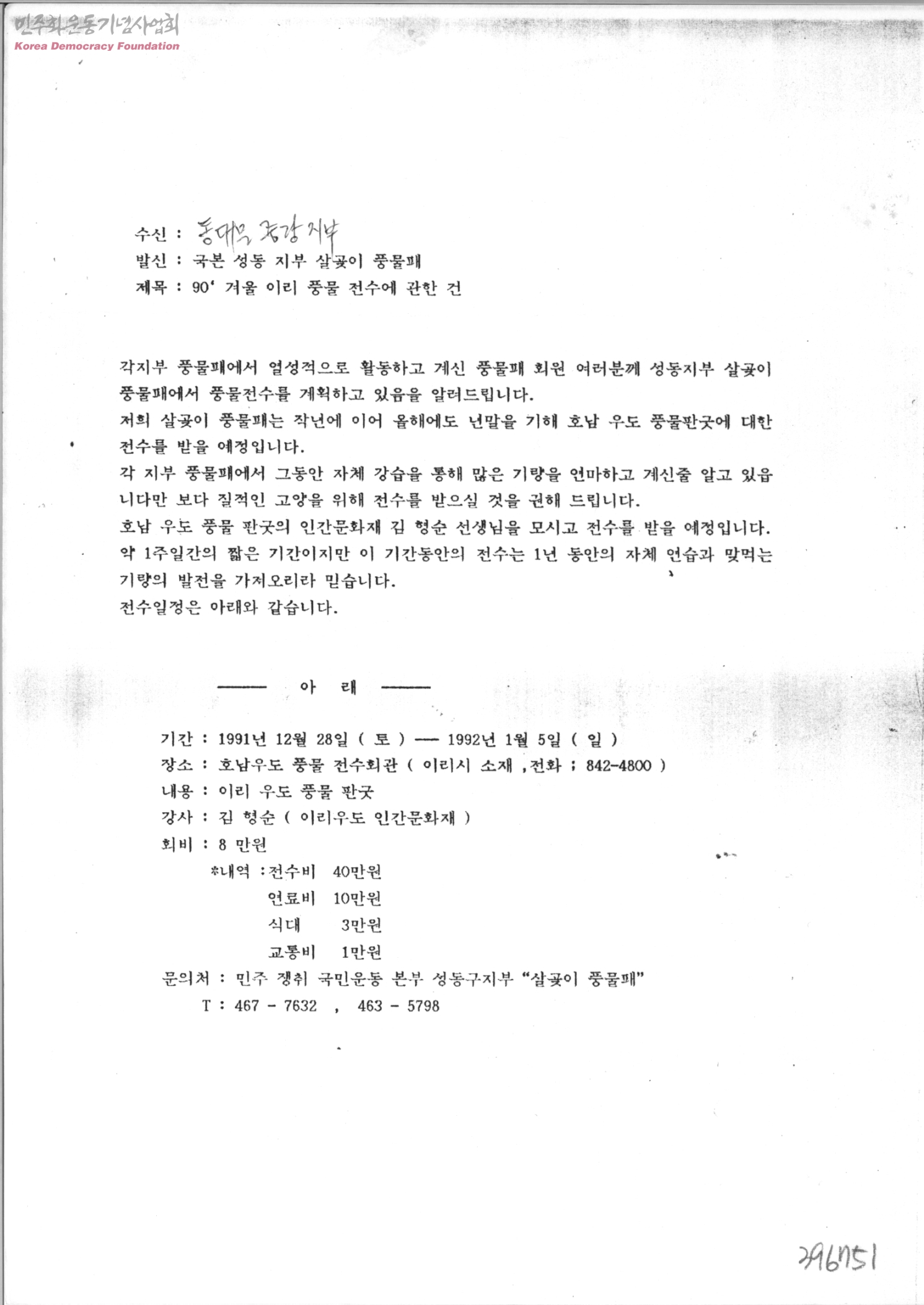 '90 겨울 이리 풍물 전수에 관한 건[수신:동대문 중랑지부,발신:민주쟁취국민운동성동구지부살곶이풍물패]