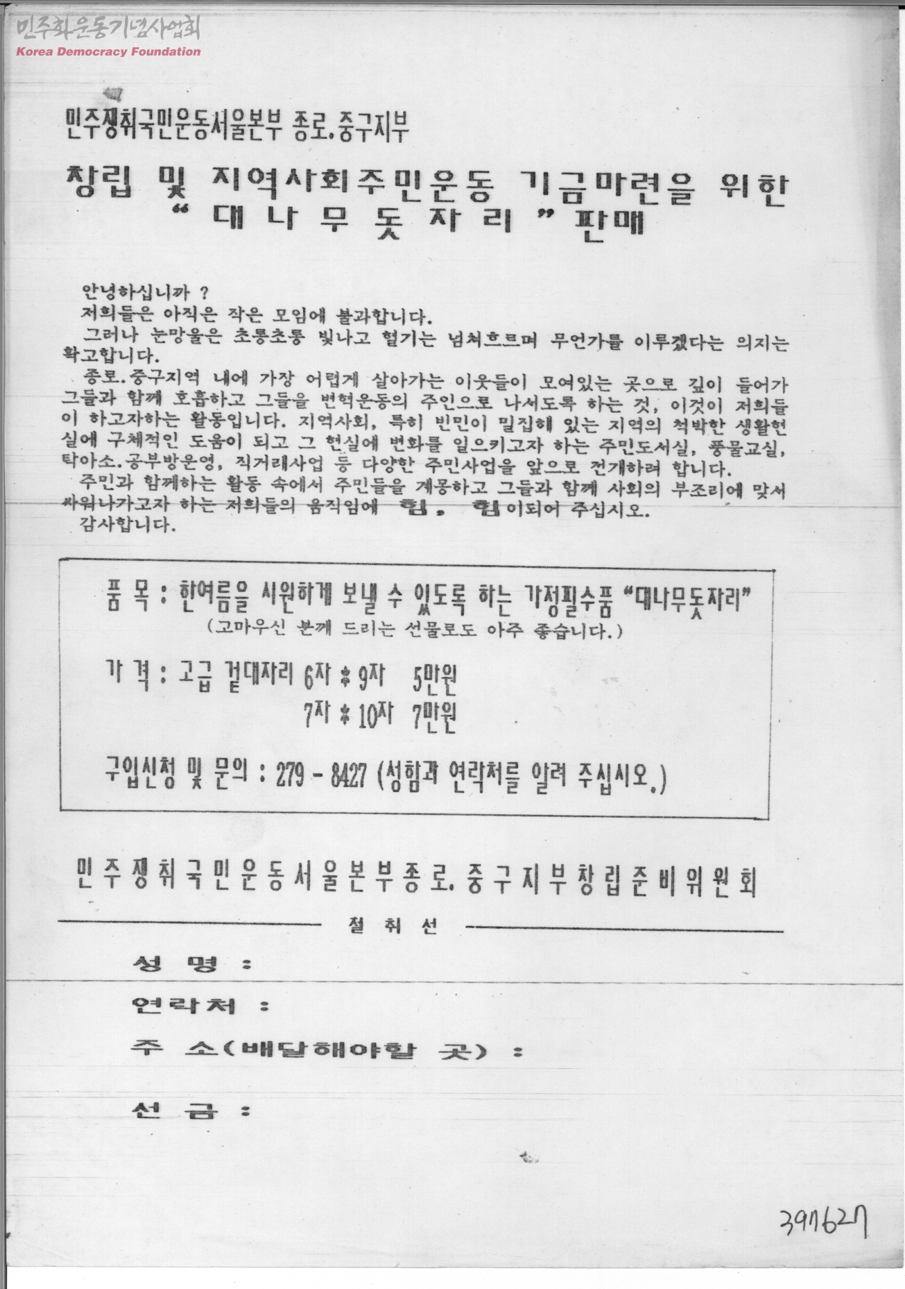 창립 및 지역사회주민운동 기금마련을 위한 "대나무돗자리" 판매