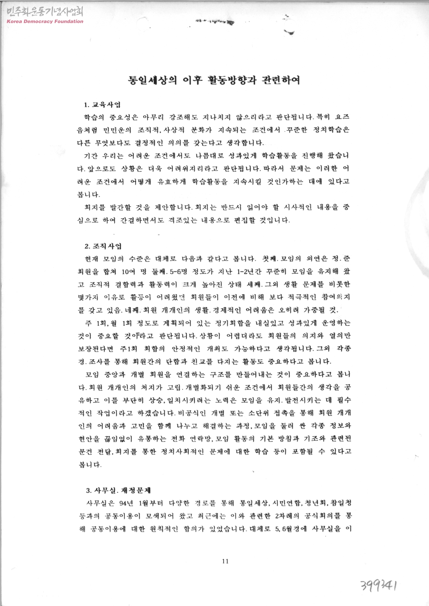 통일세상의 이후 활동방향과 관련하여