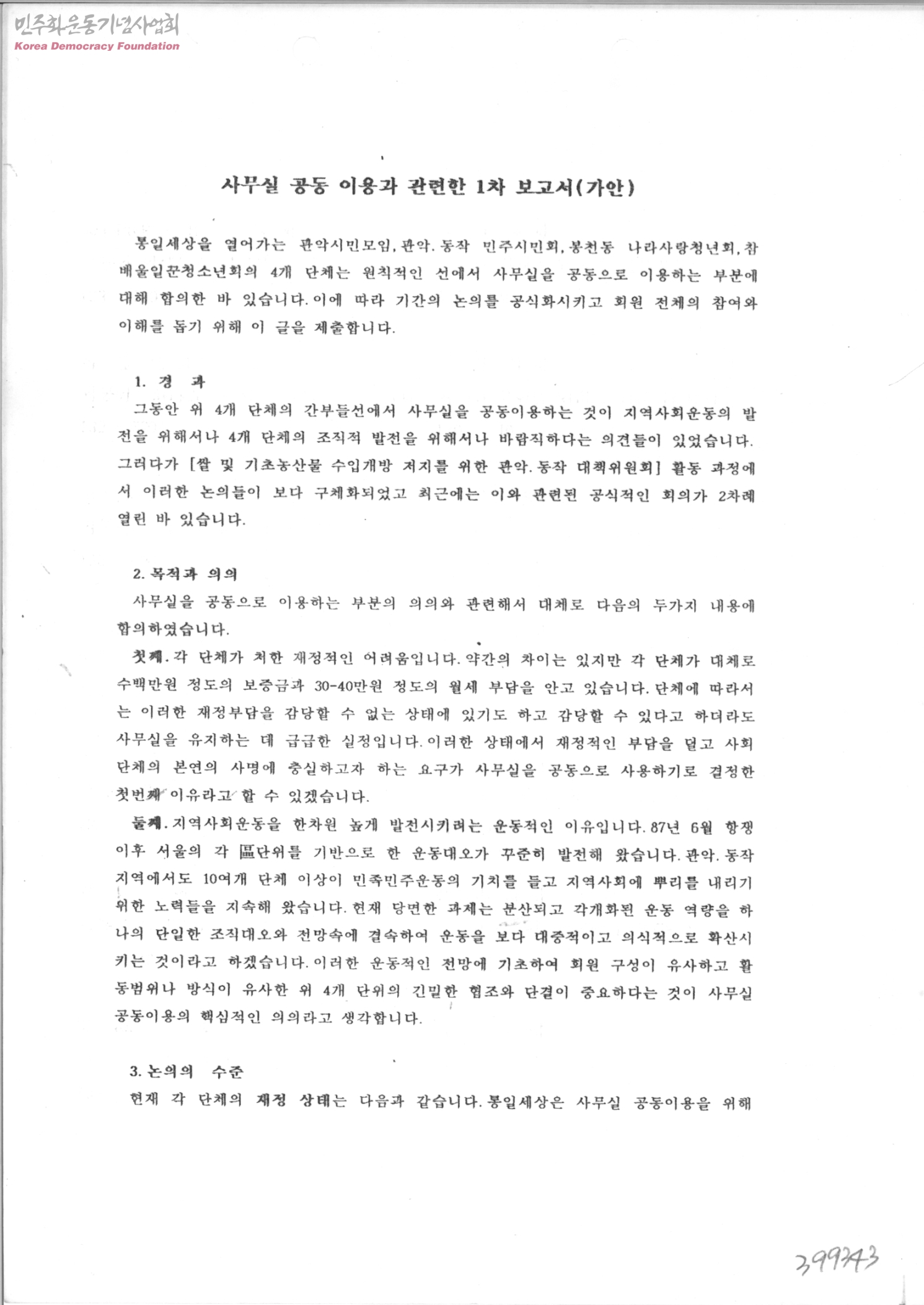 사무실 공동 이용과 관련한 1차 보고서(가안)