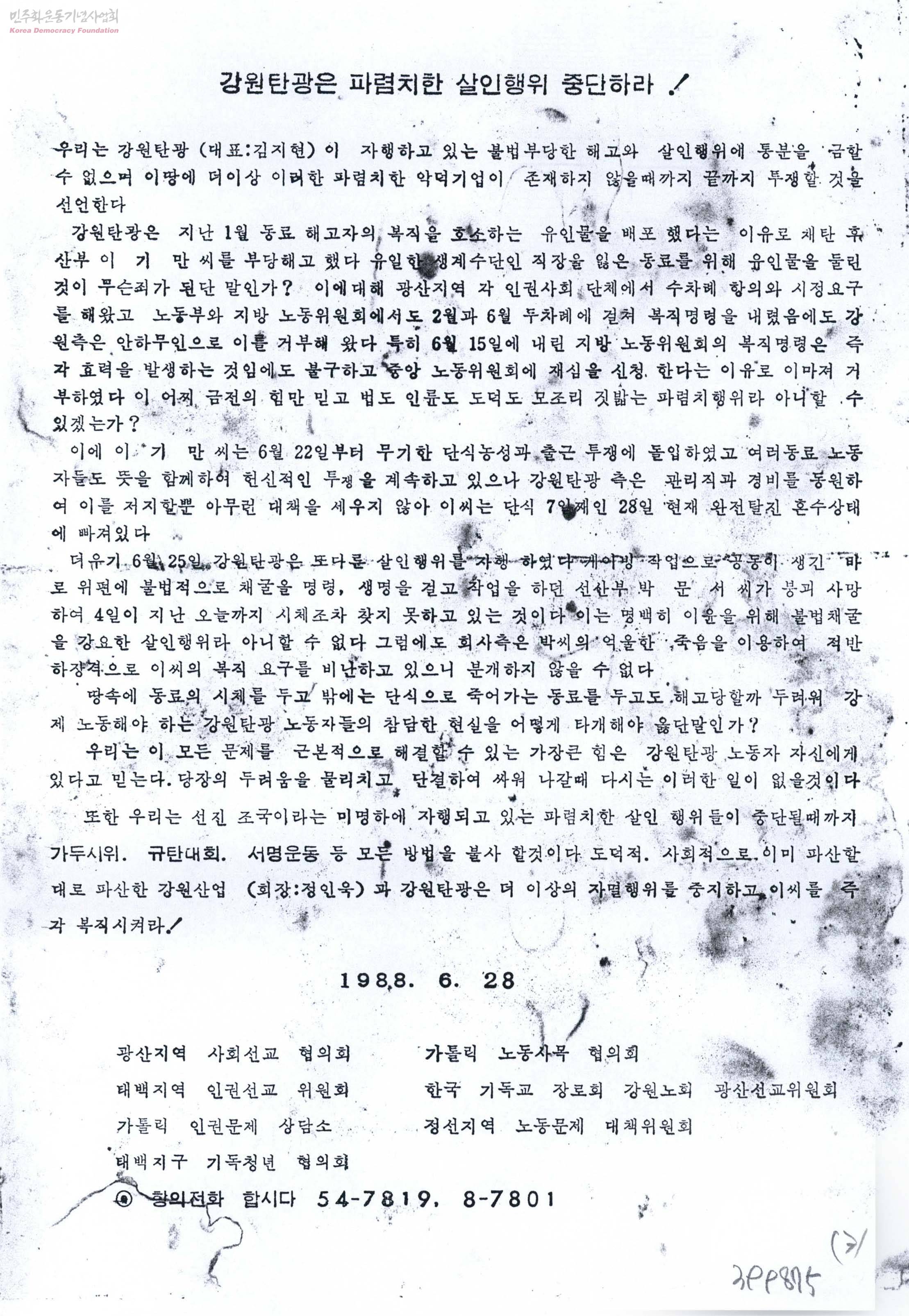- 불법적인 채굴을 명령해 결국 생명을 걸고 작업을 하던 박문서씨의 사망의 책임이 강원탄광에 있음을 지적하고, 규탄함.