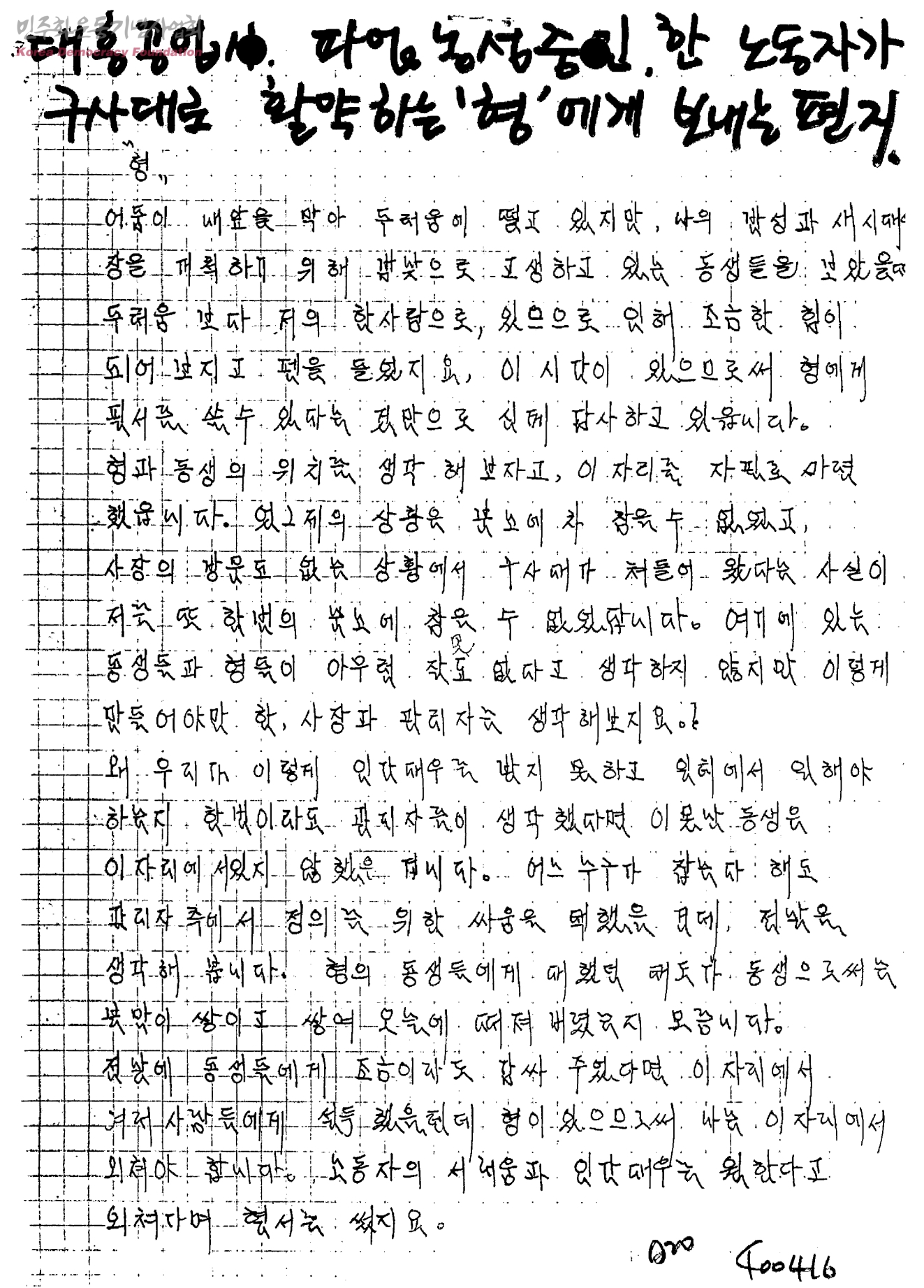 대흥공업사 파업농성중인 한 노동자가 구사대로 활약하는 '형'에게 보내는 편지