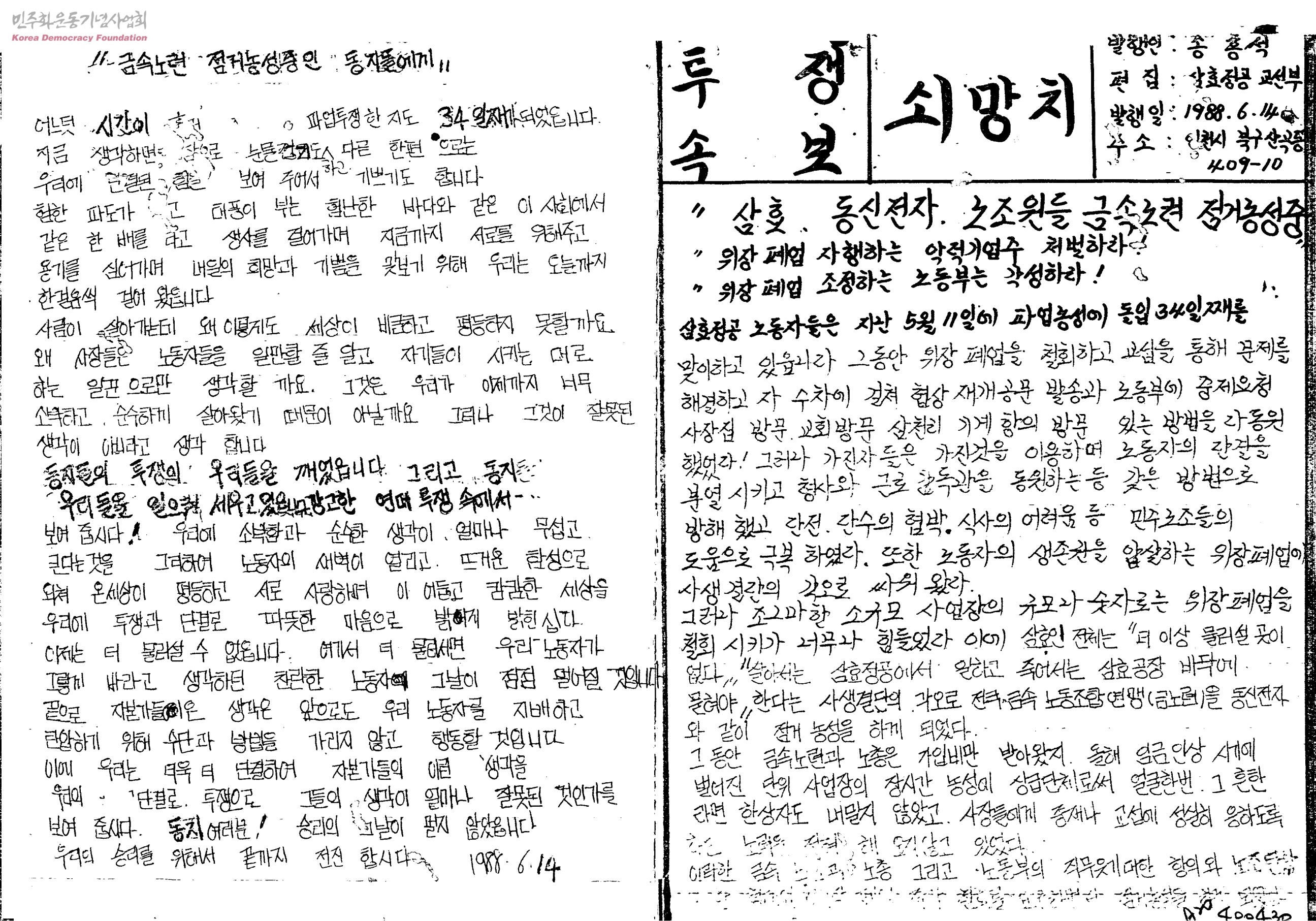 - "삼효, 동신전자 노조원들 금속노련 점거농성중