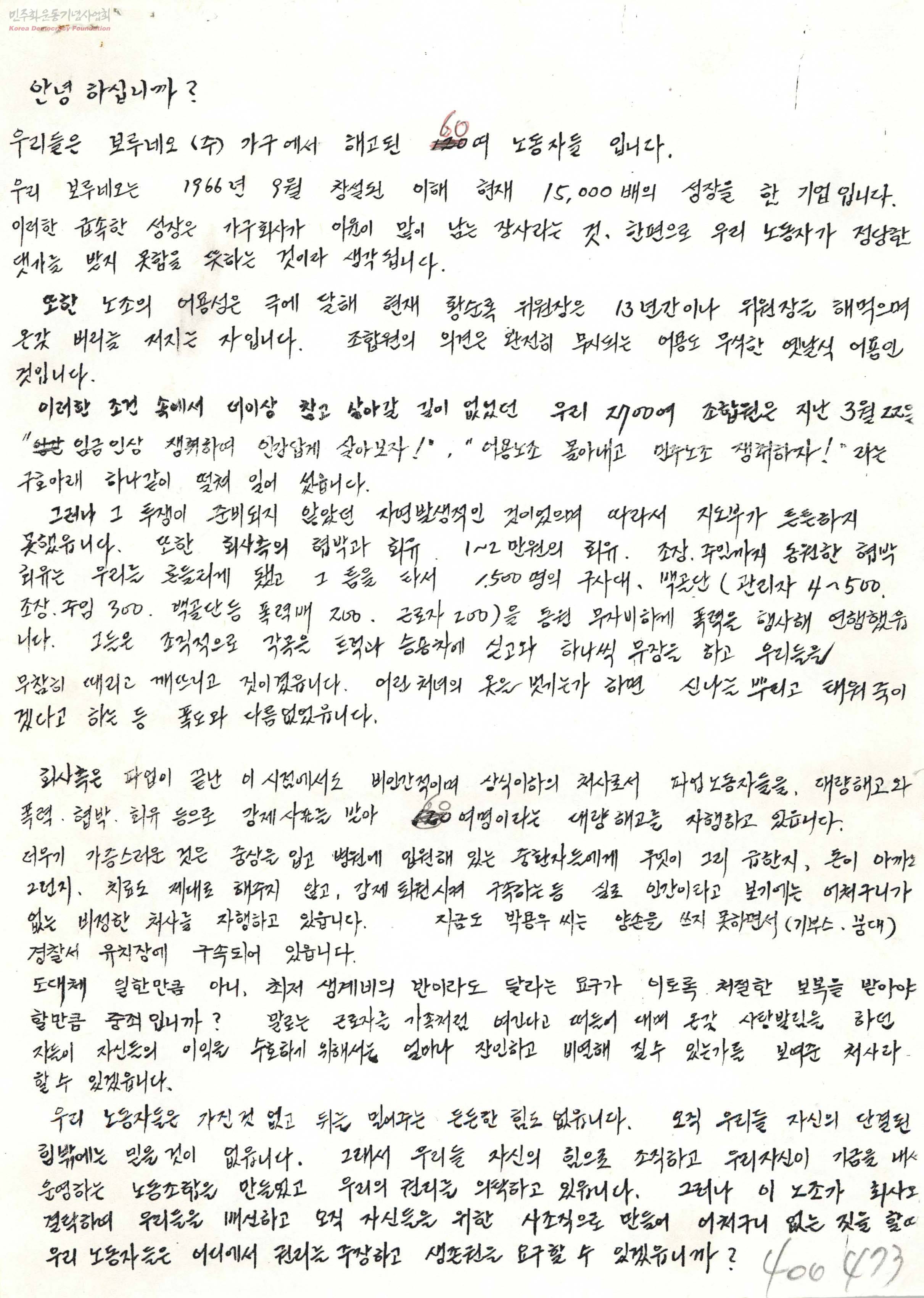 - 87년 노동자대투쟁 이후 급격히 신장된 노동자의 권리의식에 기반하여 기존의 어용노조에서 탈피해 임금협상, 기본권 문제의 본질적인 해결을 위한 민주노조 결성을 위해 투쟁하다 해직 및 구속당한 노동자들의 복직, 석방을 요구한 '보루네오가구 해고자 및 구속자 가족일동' 관련 내용. 임금인상 및 어용노조 퇴출 투쟁에 대한 사측의 폭력연행 사태를 공정하게 조사하고 보루네오 노동조합에 적극적인 지지를 촉구하는 내용