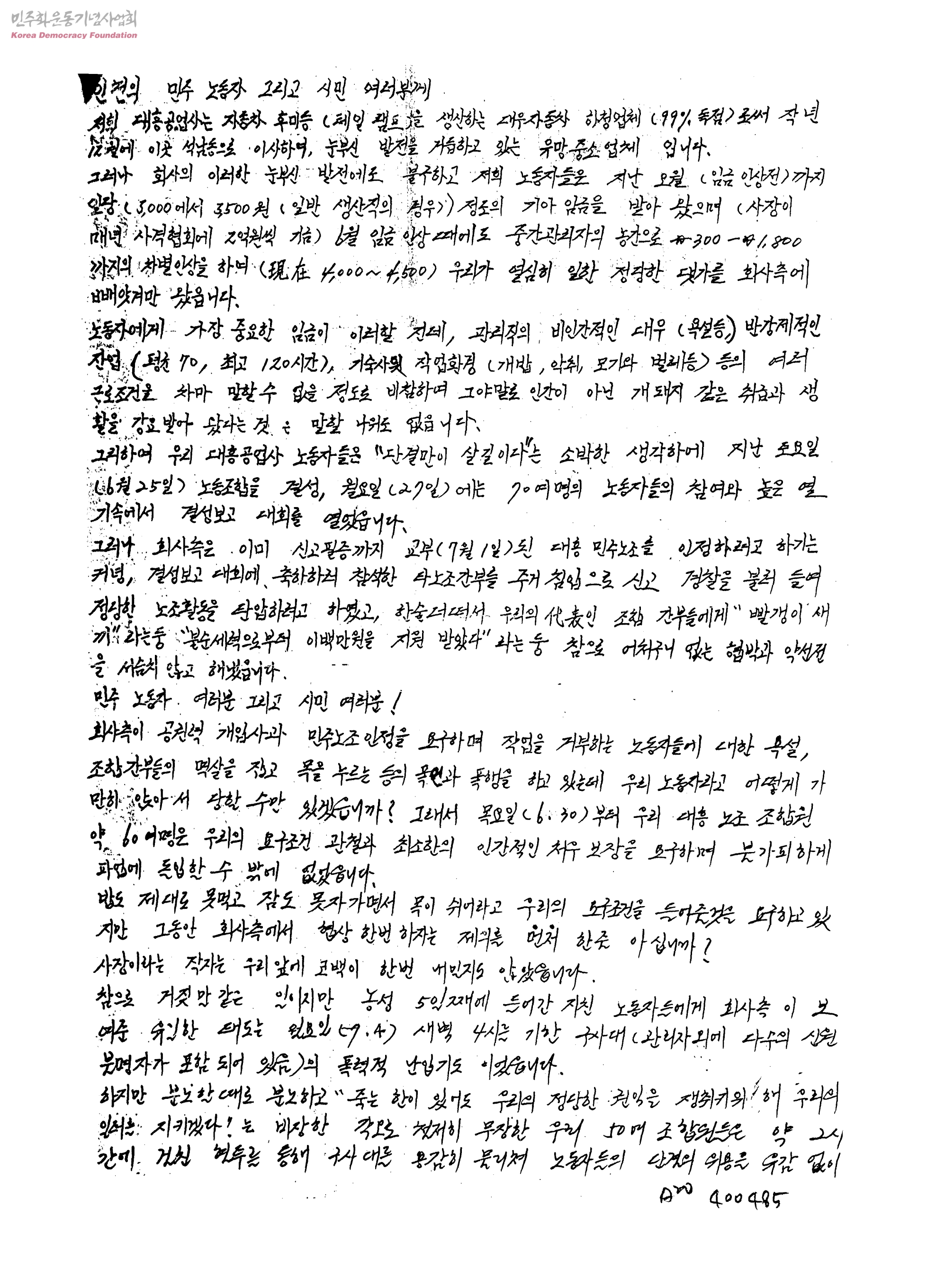 인천의 민주 노동자 그리고 시민 여러분께[민주노조 인정 요구]