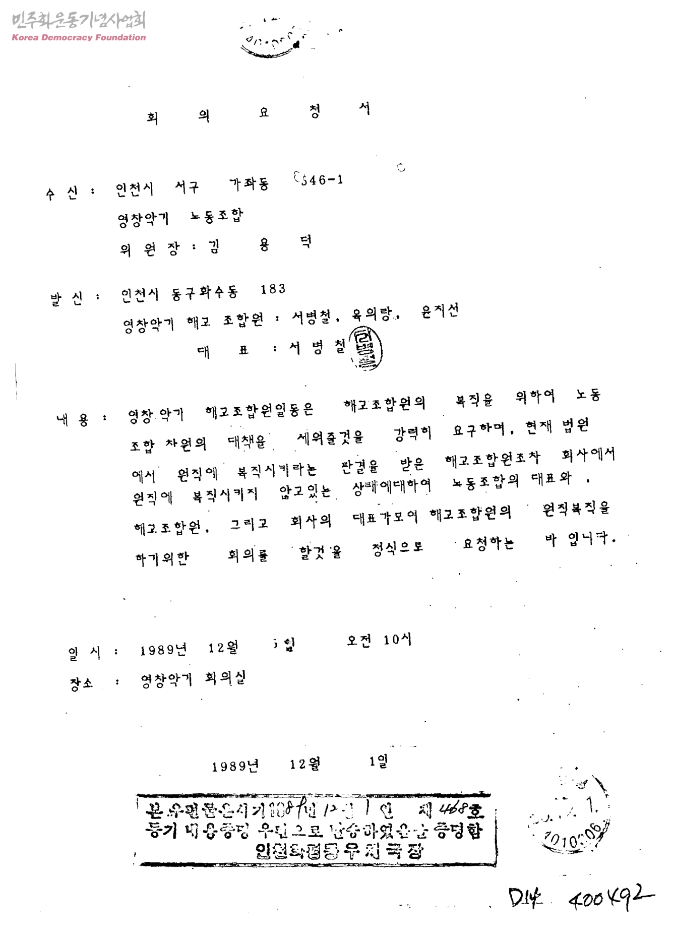 회의요청서-해고조합원 원직복직 관련[수신:영창악기노동조합, 발신:영창악기해고조합원 서병철,옥의랑,윤지선]