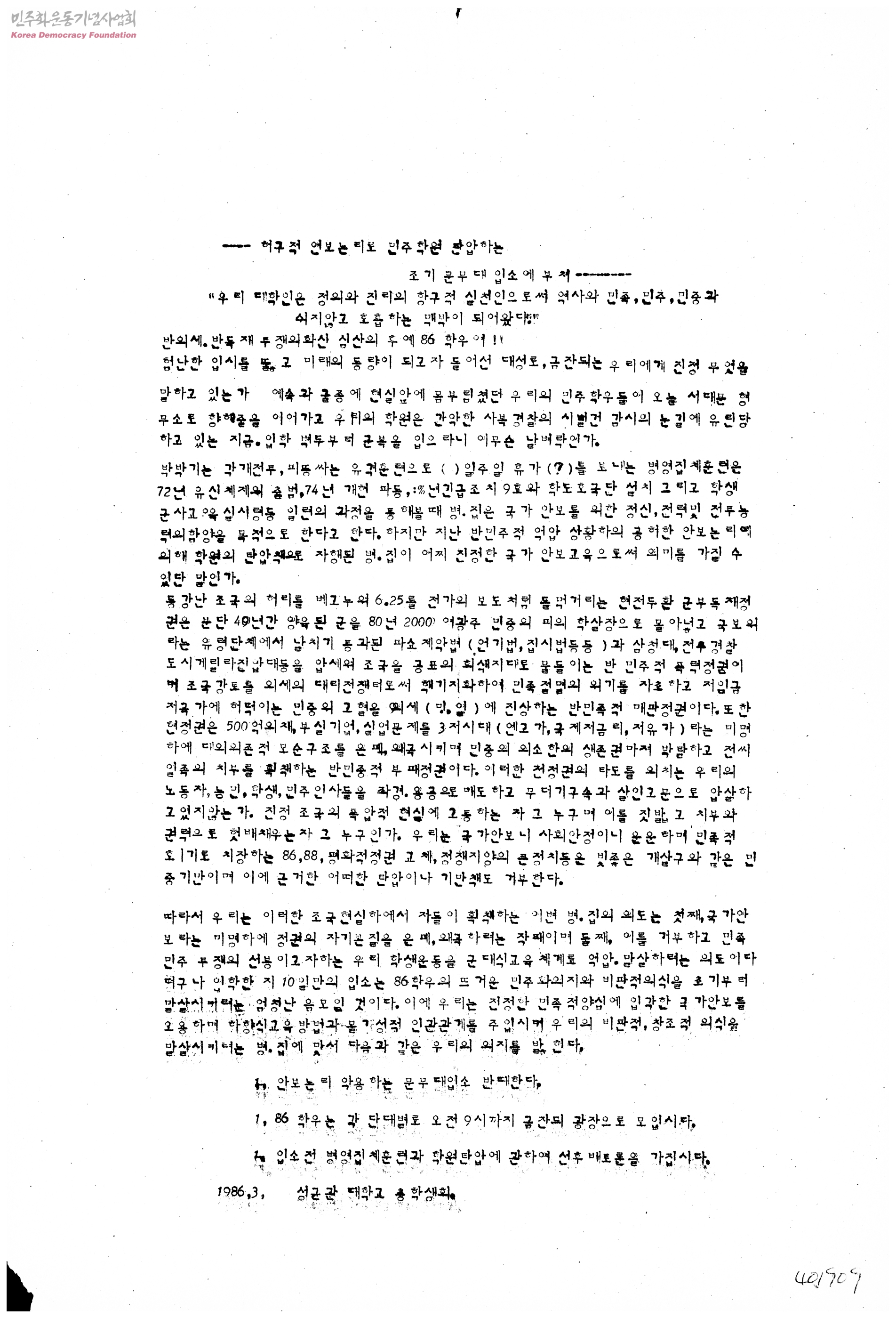허구적 안보 논리로 민주학원 탄압하는 조기 문무대 입소에 부쳐