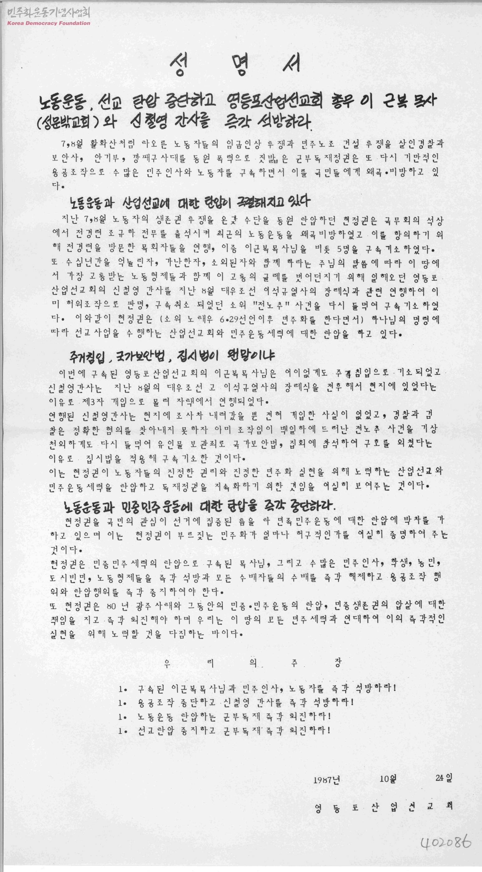 성명서-노동운동, 선교 탄압 중단하고 영등포산업선교회 총무 이 근복 목사(성문밖교회)와 신철영 간사를 즉각 석방하라.