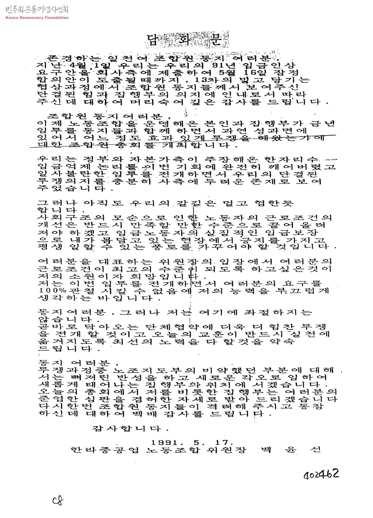 [한라중공업 91년 임투관련]담화문[한라중공업노동조합 총회개최 관련]