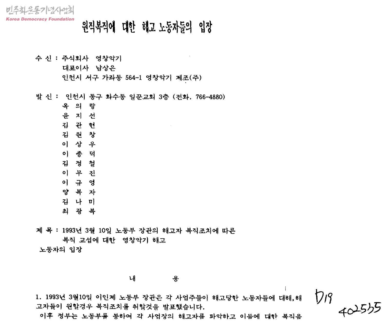 1993년 3월10일 노동부 장관의 해고자 복직조치에 따른 복직교섭에 대한 영창악기 해고 노동자의 입장[수신:영창악기제조주식회사, 발신:영창악기해고노동자일동]