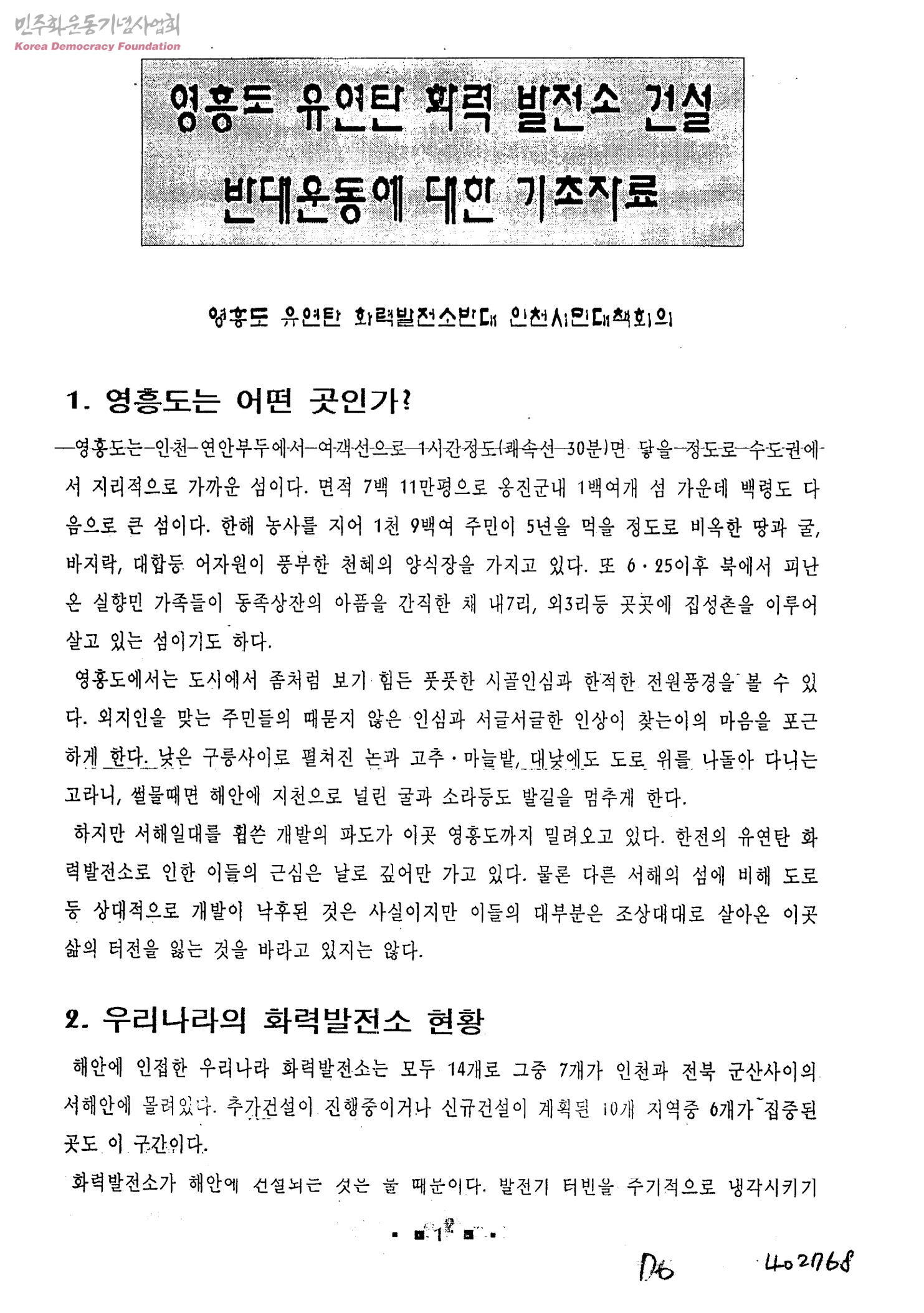 영흥도 유연탄 화력 발전소 건설 반대운동에 대한 기초자료