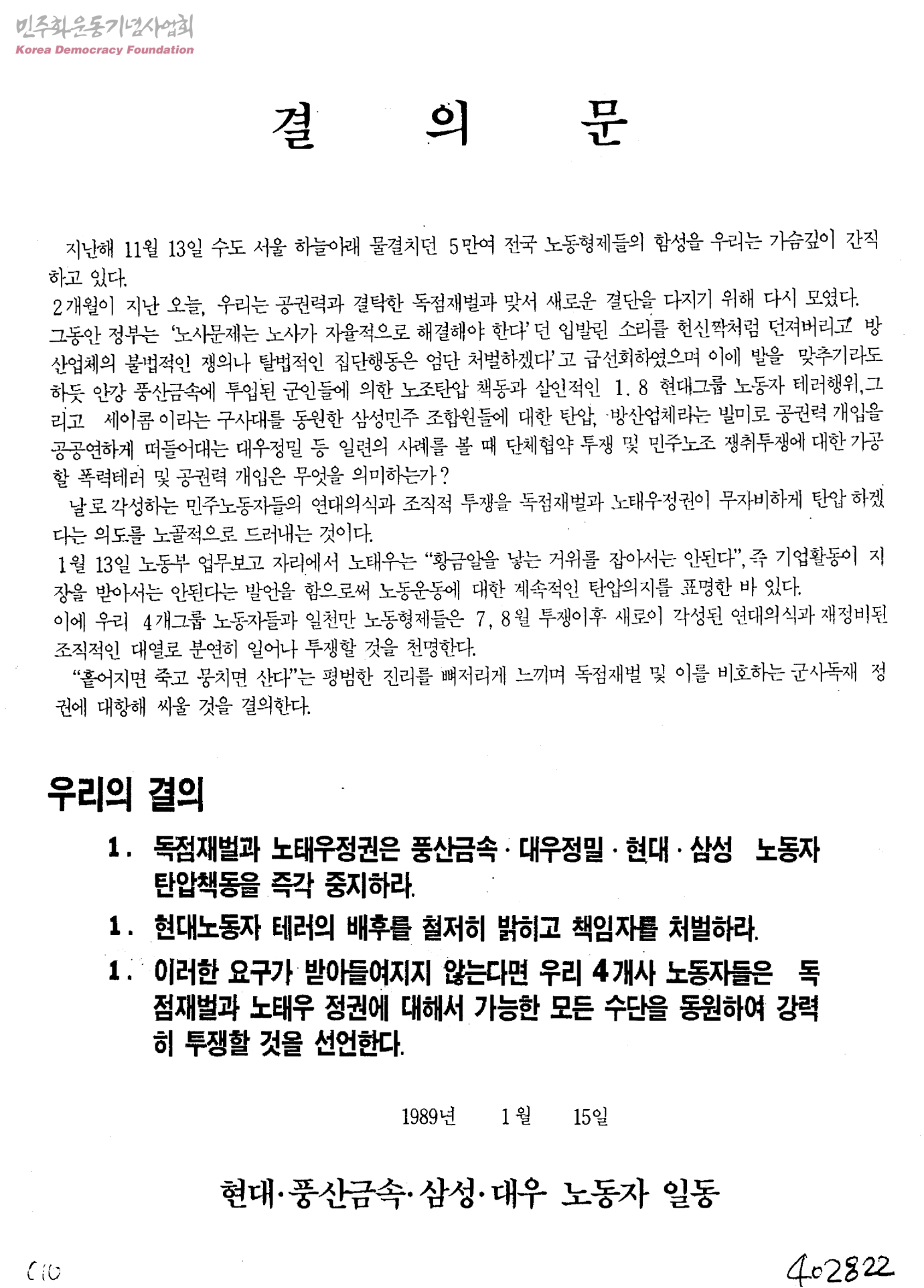 [울산 현대]결의문[현대.풍산금속.삼성.대우노동자의 탄압책동 관련]