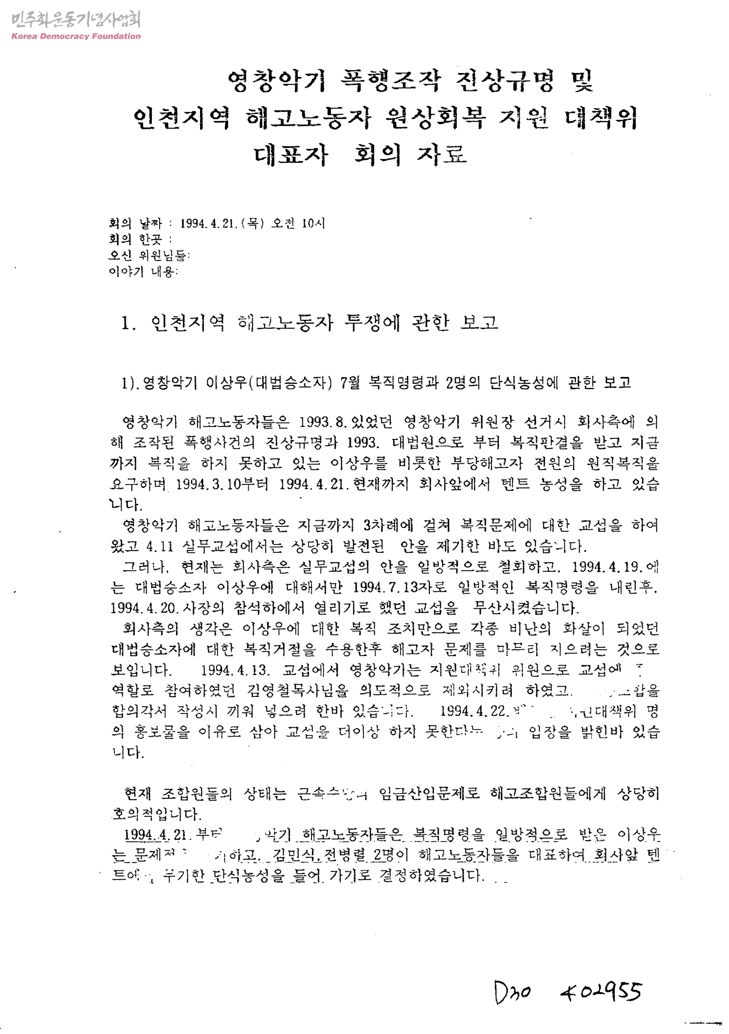 영창악기 폭행조작 진상규명 및 인천지역 해고노동자 원상회복 지원 대책위 대표자 회의자료