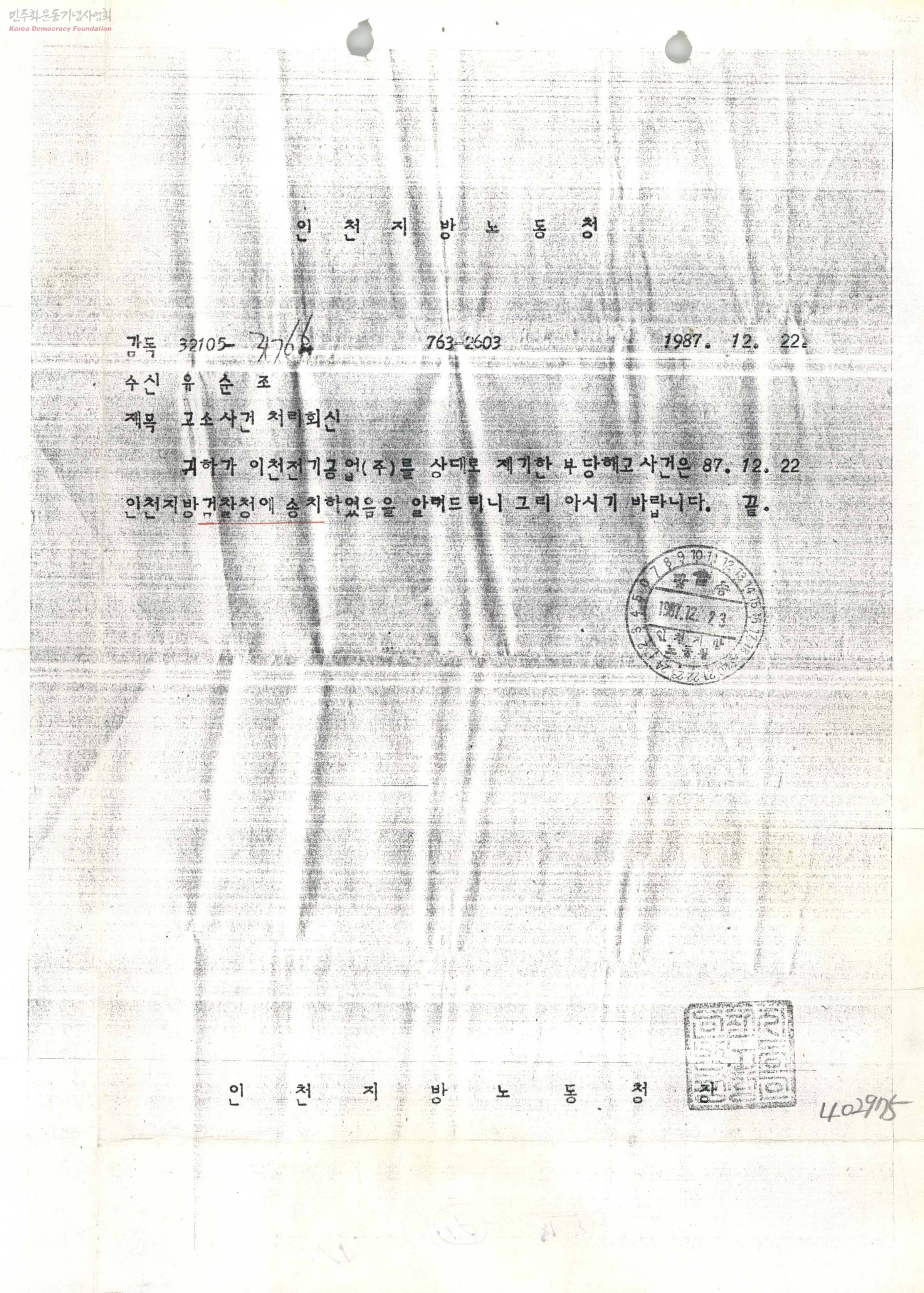 - 유순조가 이천전기를 상대로 제기한 부당해고사건 인천지방검찰청 송치 알림