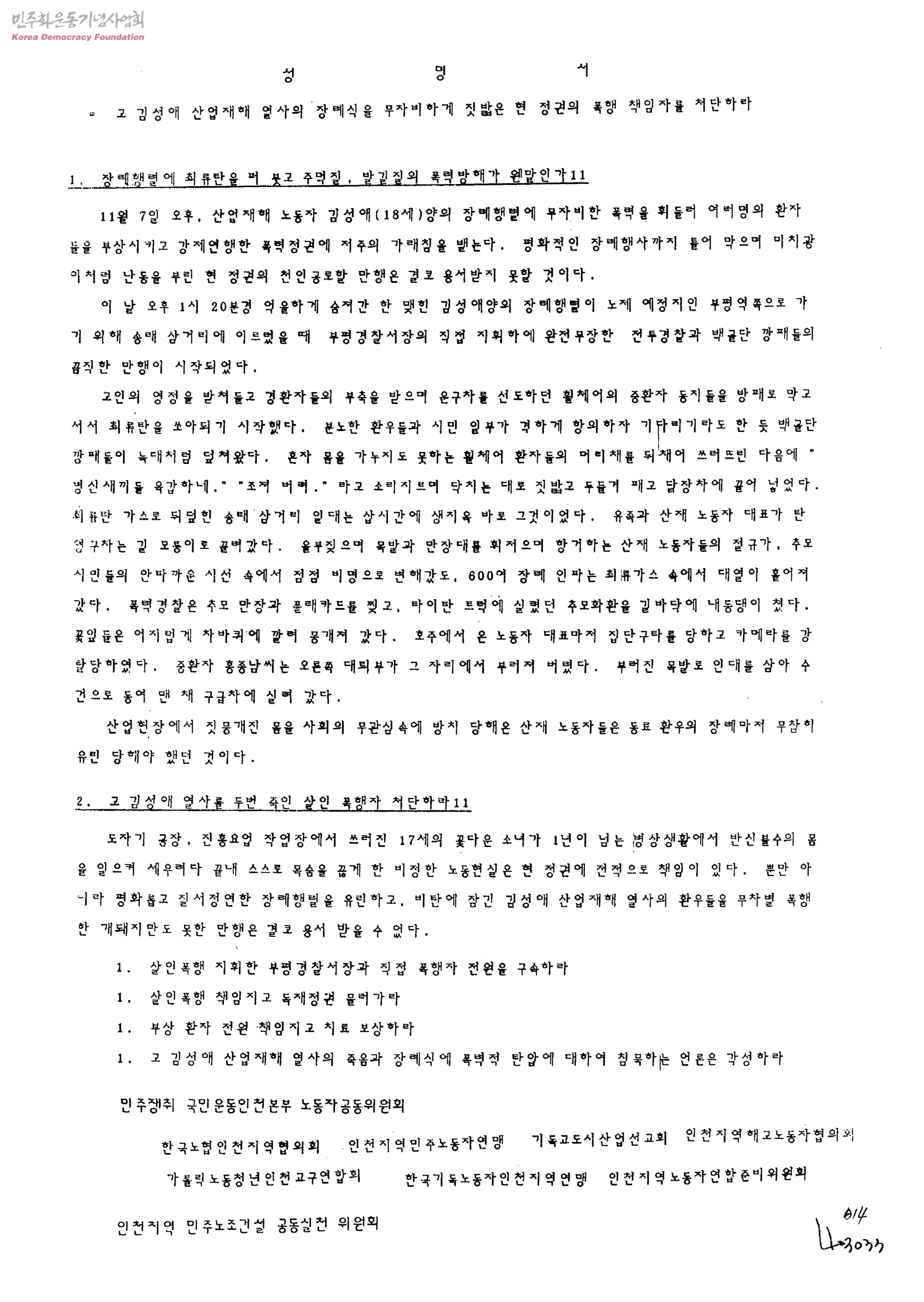 성명서-고 김성애 산업재해 열사의 장례식을 무자비하게 짓밟은 현 정권의 폭행 책임자를 처단하라